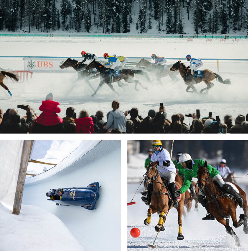 - White Turf – hästkapplöpningar på is. En av vinterns mest spektakulära traditioner där fullblodshästar tävlar på den frusna sjön. Skijoring, där skidåkare dras bakom hästar, är höjdpunkten. 8, 15 & 22/2 2026.