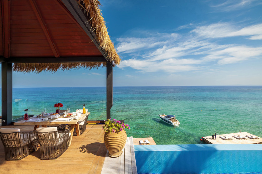 Alla nio villor är inramade av rosa bougainvillea och byggda åtta till tio meter över vattenytan, för att säkerställa total avskildhet tillsammans med oavbrutna vyer över det turkosa vattnet. Du behöver bara ta ett par barfotasteg från din privata, uppvärmda pool för att komma ner till sandstranden. Villorna har upp till fyra sovrum och vissa har en privat del av stranden. Där hittar du även Porto Zantes spa som lockar med över 20 behandlingar från världens alla hörn.