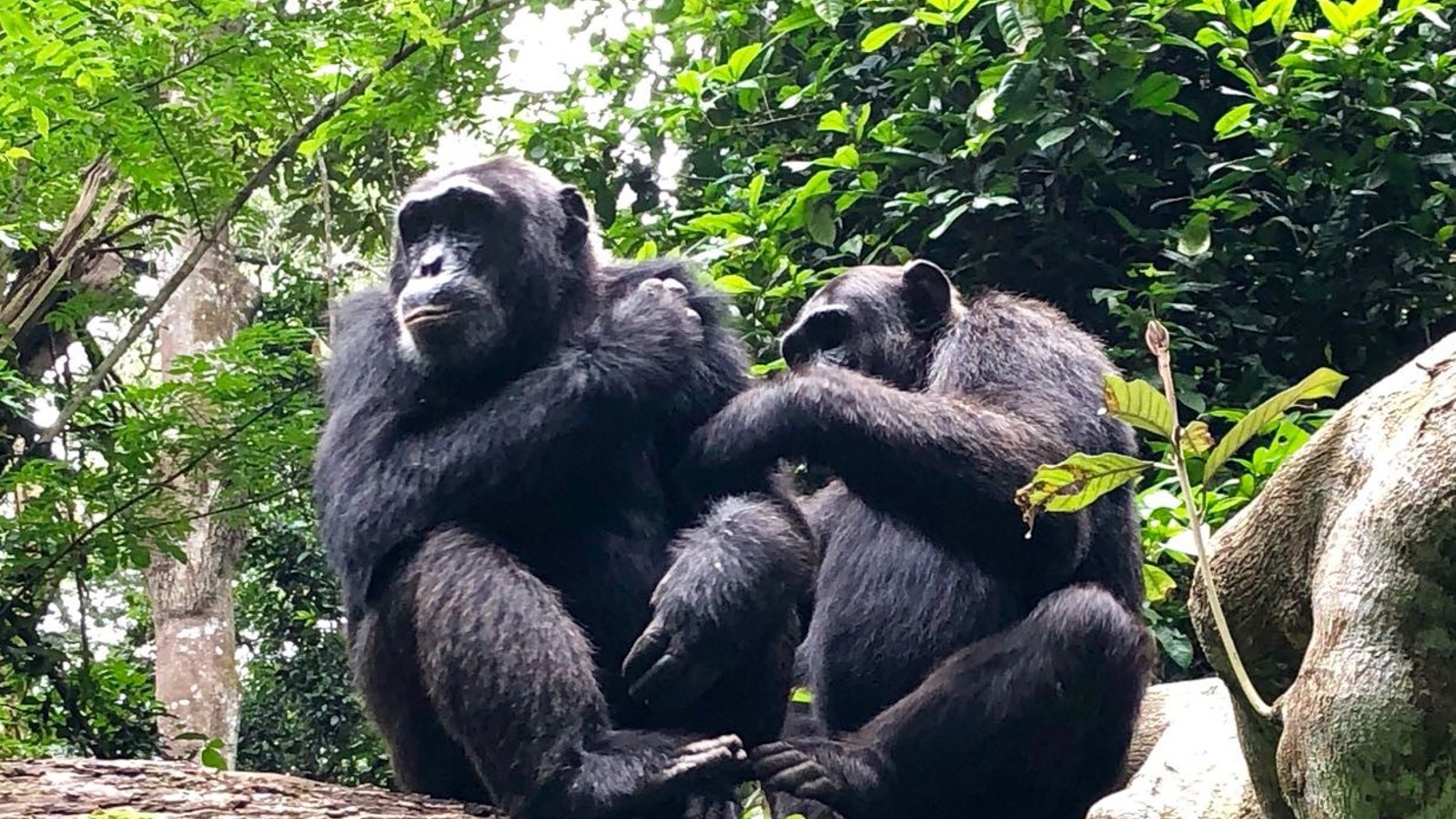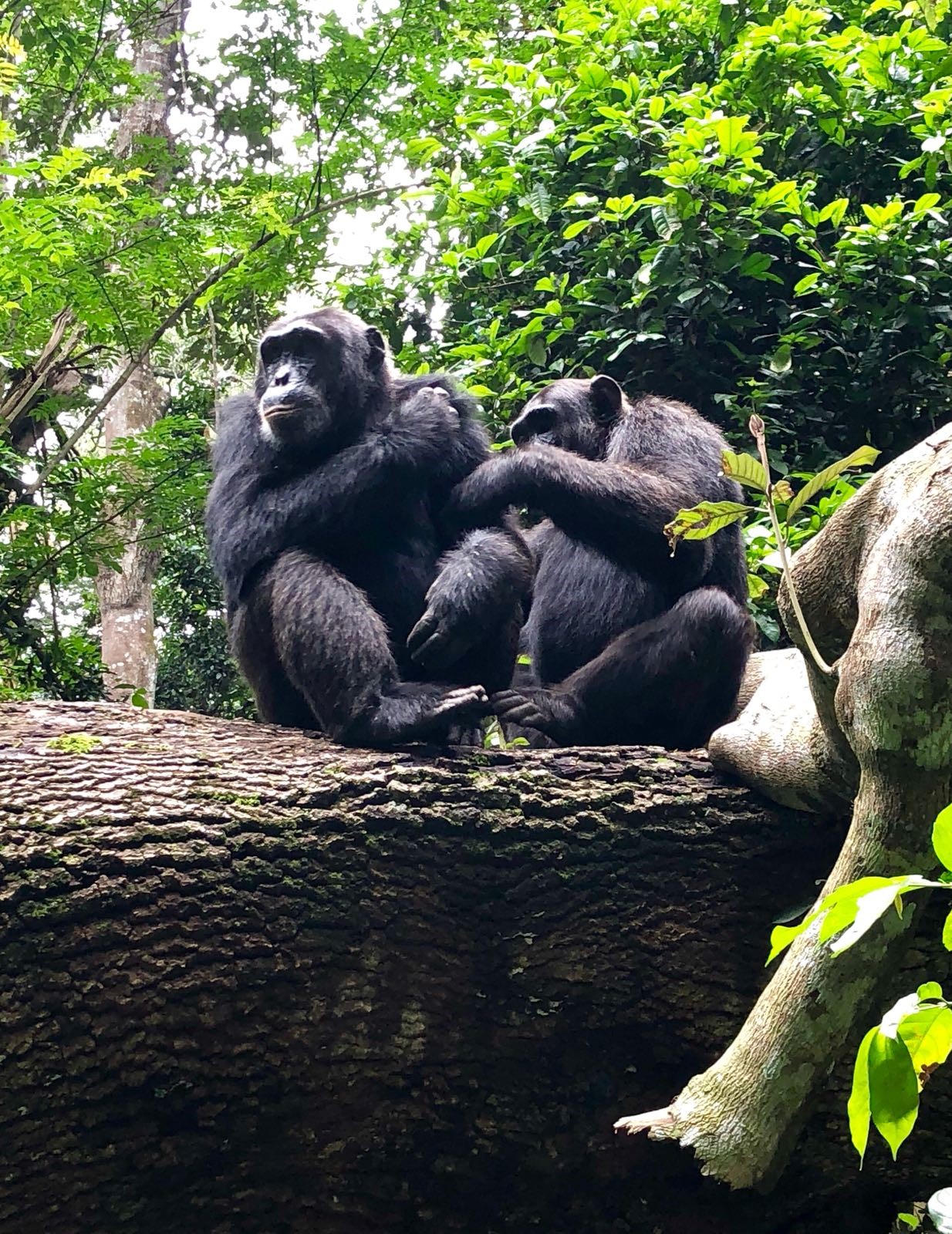 Väldigt annorlunda jämfört med bergsgorillorna. Det var lättare spårning eftersom marken var platt och undervegetationen mindre. Schimpanserna är betydligt vanare vid människor. De satt och groomade varandra helt avslappnat och jag fick nästan en känsla av att vissa av dem poserade när vi tog kort.