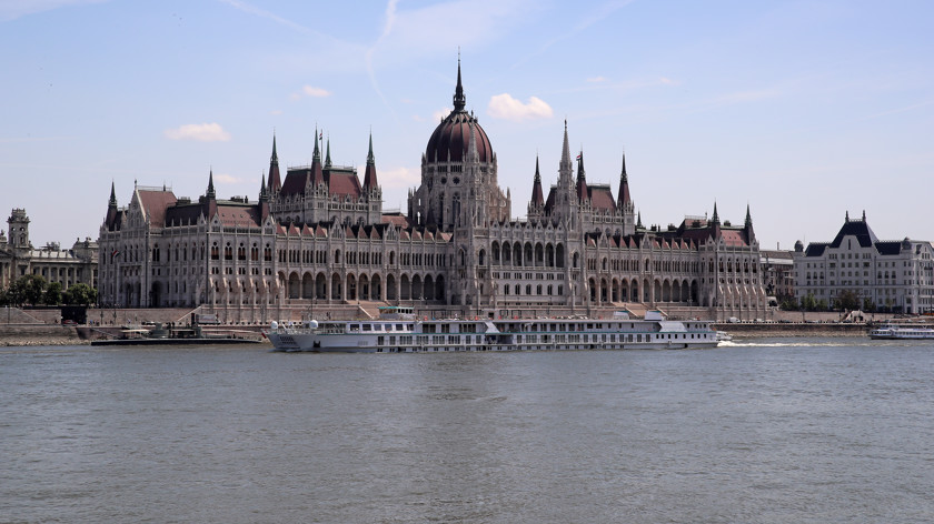 Riverside Mozart utanför den pampiga parlamentsbyggnaden i Budapest.