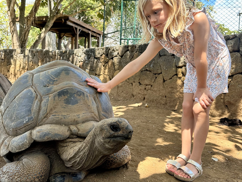 Lyckan för oss var gjord när vi upptäckte hotellets fem gigantiska landsköldpaddor och jag är så glad att vi inte la tid och pengar på att åka till en av nationalparkerna när vi de facto bodde granne med dessa vänliga och mycket långsamma 300-kilos klumpedunsar. Freja älskar djur lika mycket som jag och på Anahita var vi fria att gå in till sköldpaddorna varje dag. Den största mätte drygt 120 centimeter över skalet och hade fokus på att vila när den inte mumsade på färska löv och gurka. Helt rimligt med tanke på att den hade mer än 100 år på nacken.