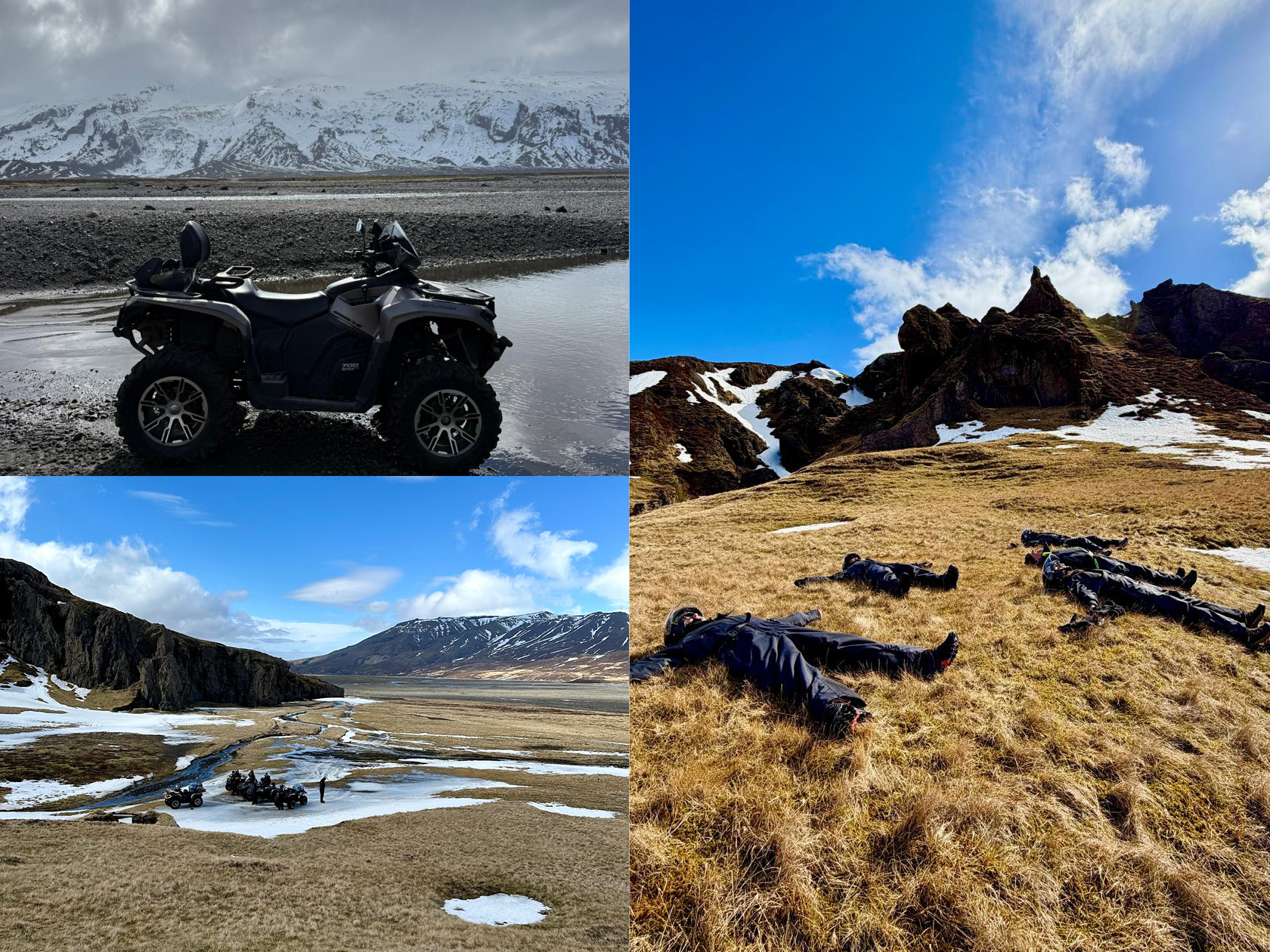 Fyrhjulingsguiden Unnar är ett unikum. Han skämtar oavbrutet och det är svårt att avgöra vad som faktiskt är på allvar. Iklädda overaller, handskar och hjälmar med visir ger vi oss ut i ett landskap omgivet av höga berg med snötäckta toppar. På fyrhjulingarna tar vi oss obehindrat fram över både forsande vattendrag och steniga partier.