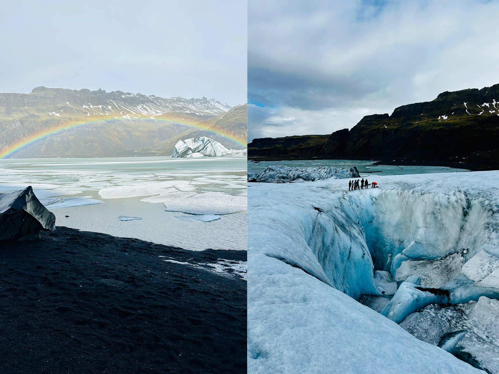 Utrustade med stegjärn, hjälm och isyxa ger vi oss ut på en vandring på glaciären Sólheimajökull. Solen bryter fram bakom de grå molnen och på andra sidan lagunen syns en overkligt vacker regnbåge. Under våra fötter knastrar den blåskimrande isen, genomdragen av svarta stråk av vulkanaska. Glaciärguiden Jón leder oss mellan djupa sprickor och små smältvattensbäckar som slingrar sig över isens yta. Det är en märklig känsla – som att gå på något uråldrigt men samtidigt levande, en tung kropp av is som långsamt rör sig och förändras för varje år som går.