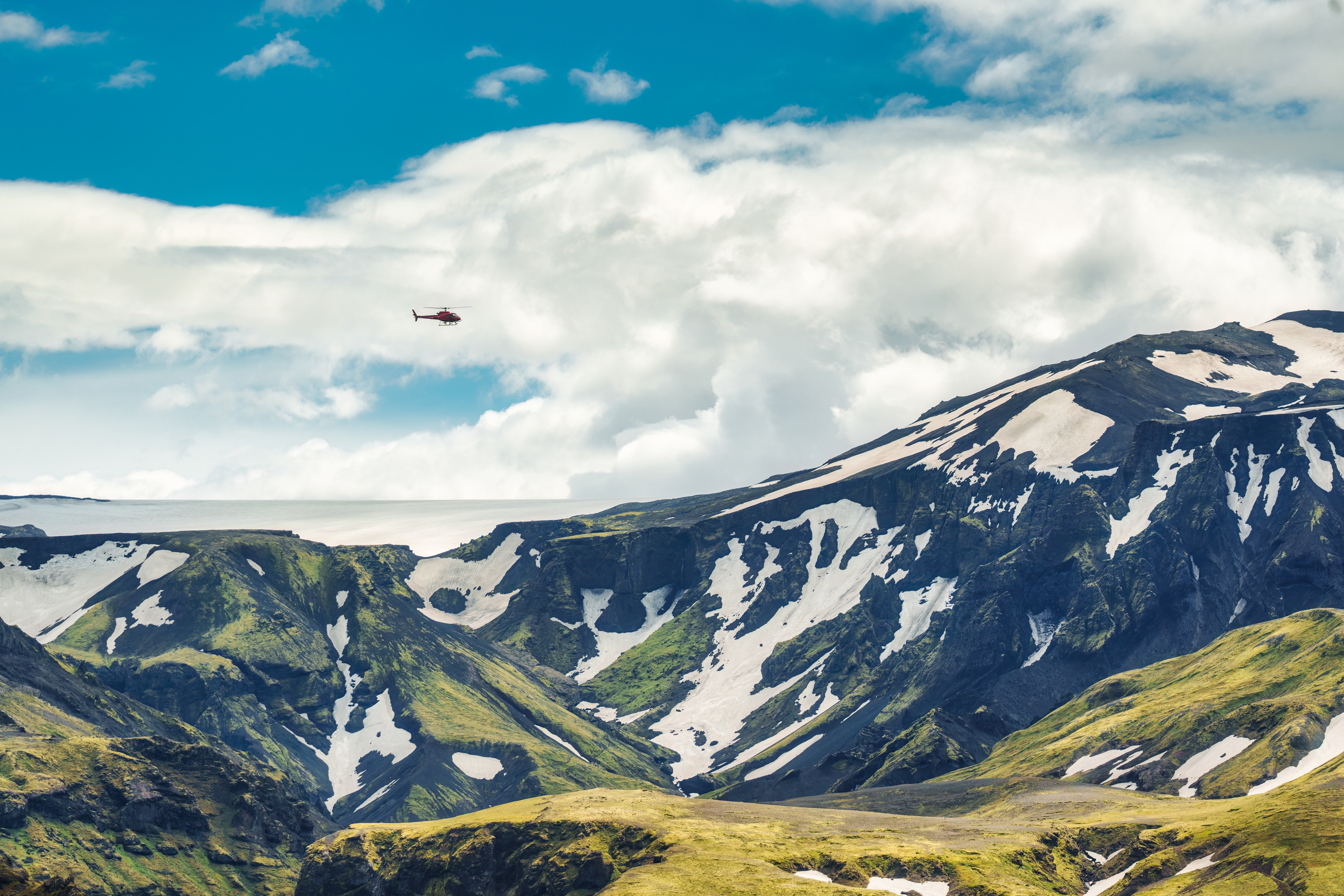 Helikoptern lyfter och lämnar vägarna bakom sig. Nedanför breder glaciärer och lavafält ut sig innan ni landar på en avlägsen topp. Inga spår. Ingen annan. Bara utsikten – och ett glas champagne i handen.