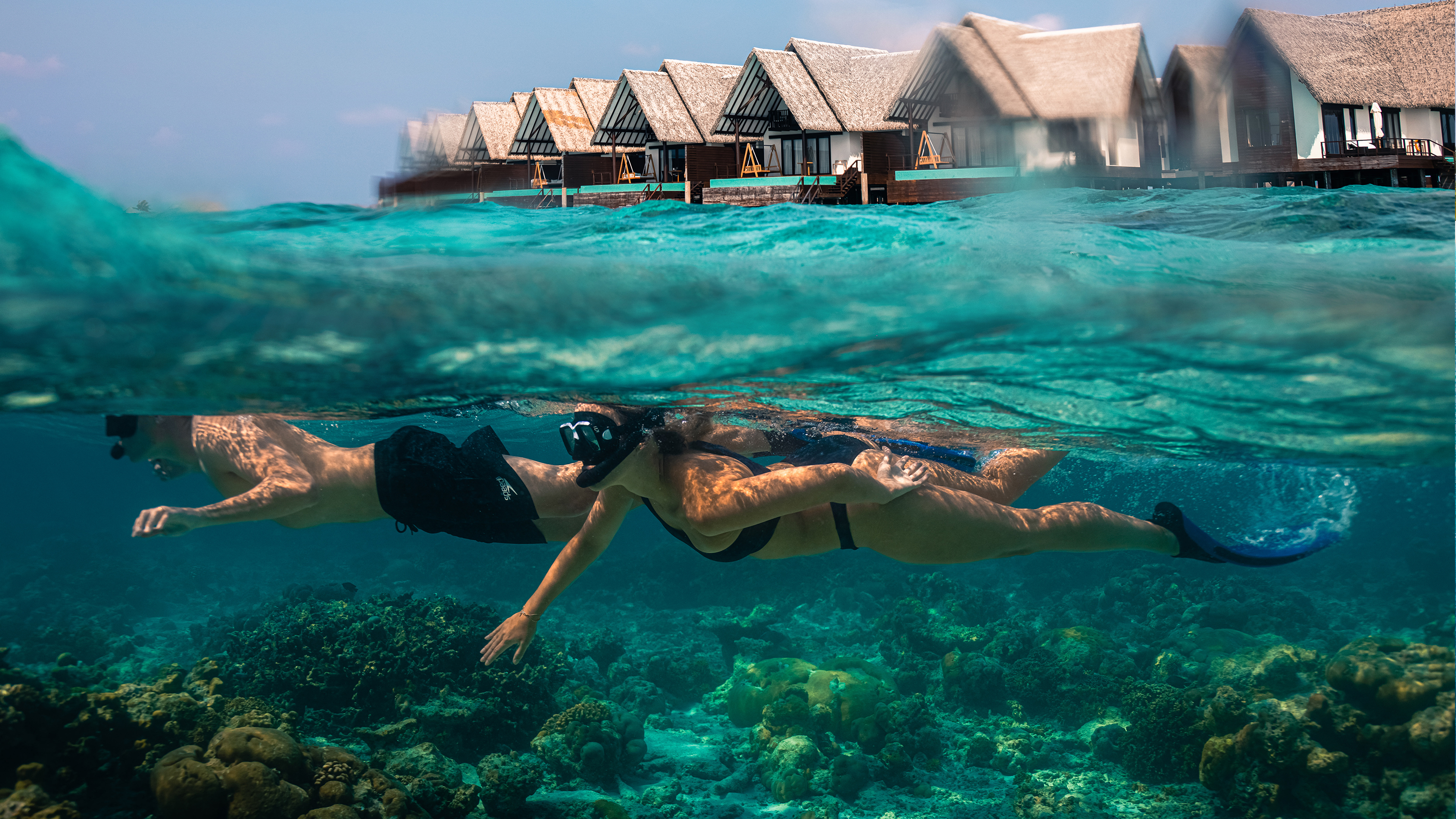 Runt hela ön löper ett korallrev som det går utmärkt att vada till. Under vattenytan simmar färgglada, tropiska fiskar och har du tur kan du även få syn på både rockor stora som brunnslock, havssköldpaddor och black tip reef sharks.