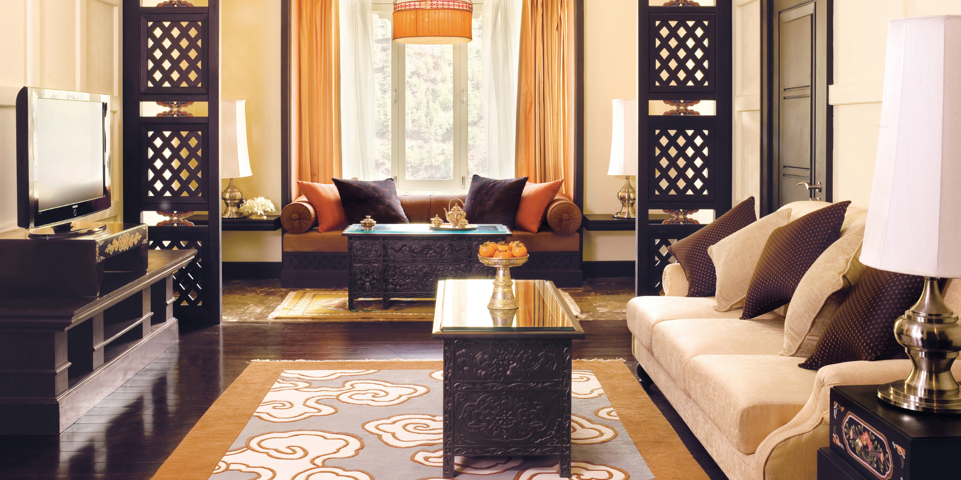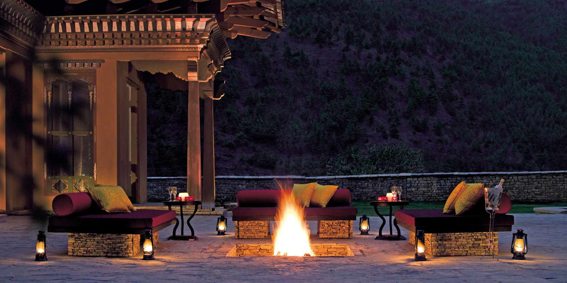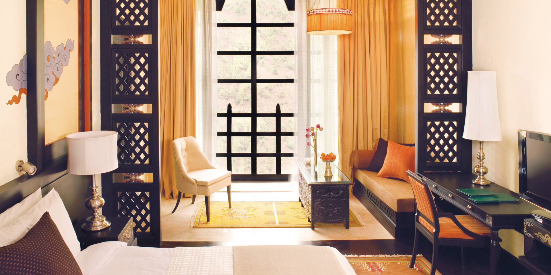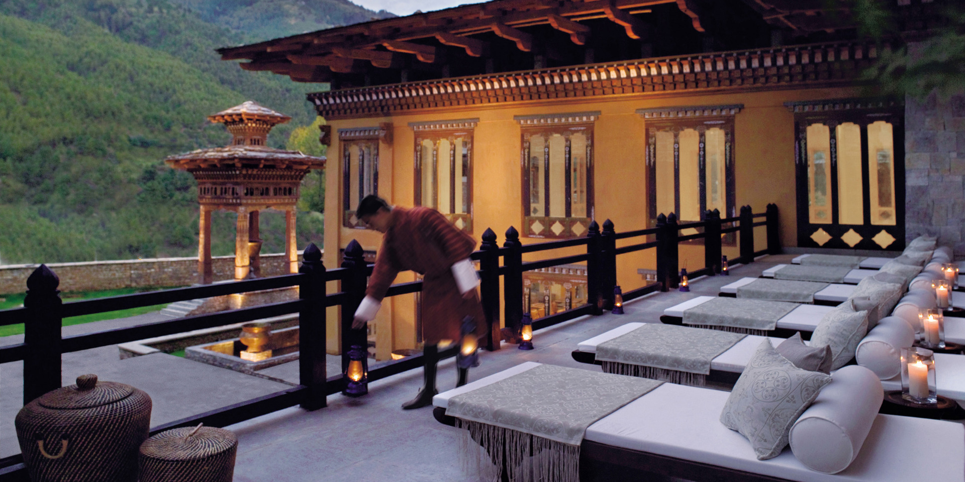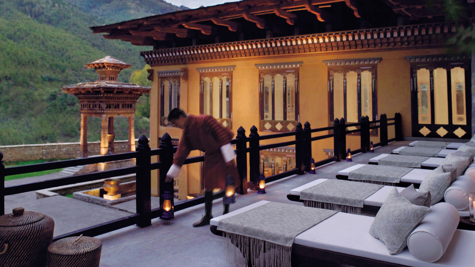 Mitt i Åskdrakens eget land och dalen Thimphu ligger magnifika Taj Tashi. Alla hotellets rum och sviter är inredda i en vacker blandning av Bhutans historiska Dzong-arkitektur och modern design. Handritade buddhistiska väggmålningar i traditionella färger pryder alla de smkafulla rummen och sviterna, som dessutom har en hänförande vacker utsikt över Himalayas dramatiska berg och höga himmel. Närheten till huvudstadens sevärdheter och butiker är perfekt för egna utflykter. I de fyra restaurangerna serveras Bhutans eldiga mat på bästa sätt, såväl som tibetanska specialiteter och europeiska rätter. På Jiva Spa erbjuds traditionella behandlingar i en rofylld miljö av trä och marmor där bad med varma stenar i specialgjorda kar är en härlig upplevelse.