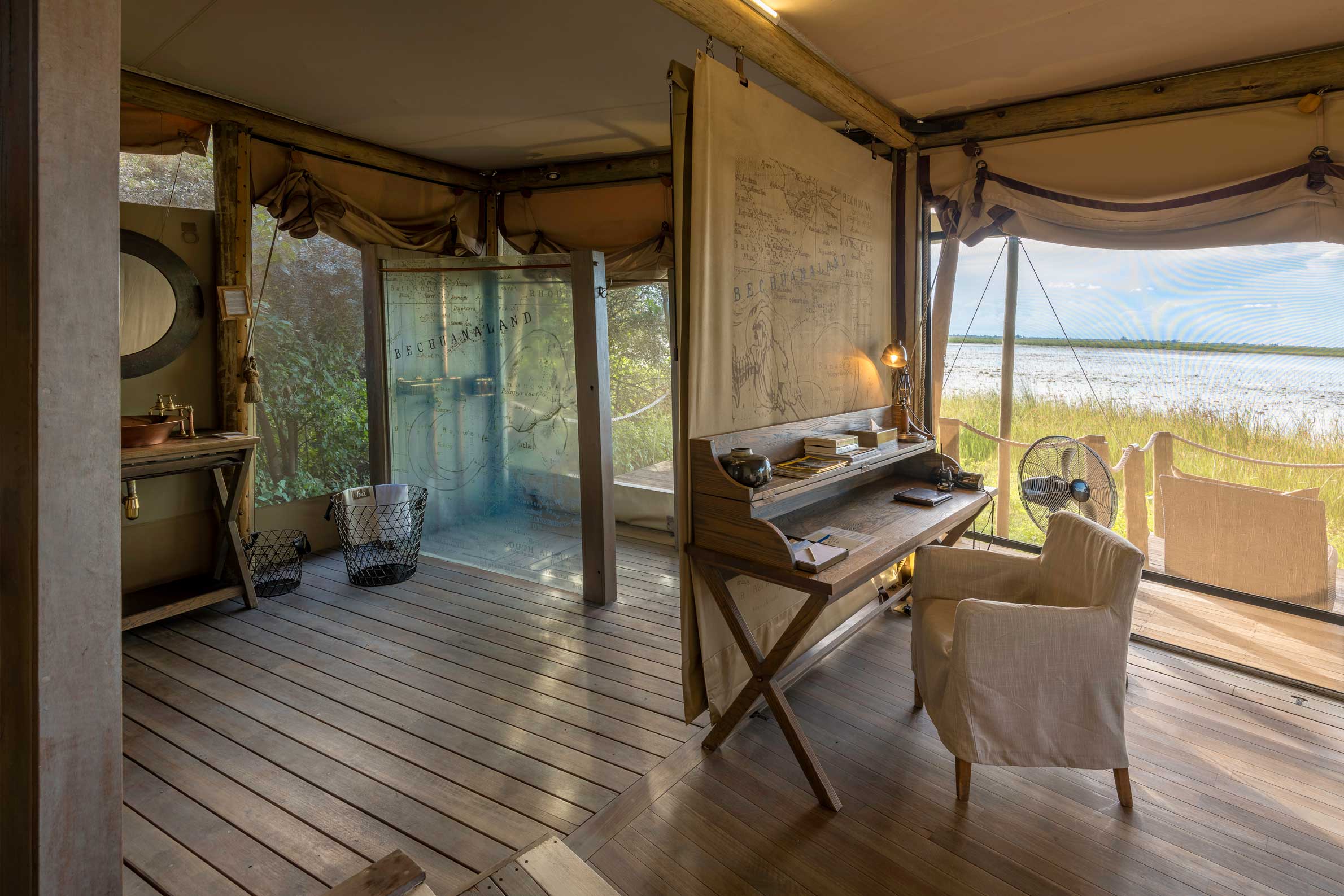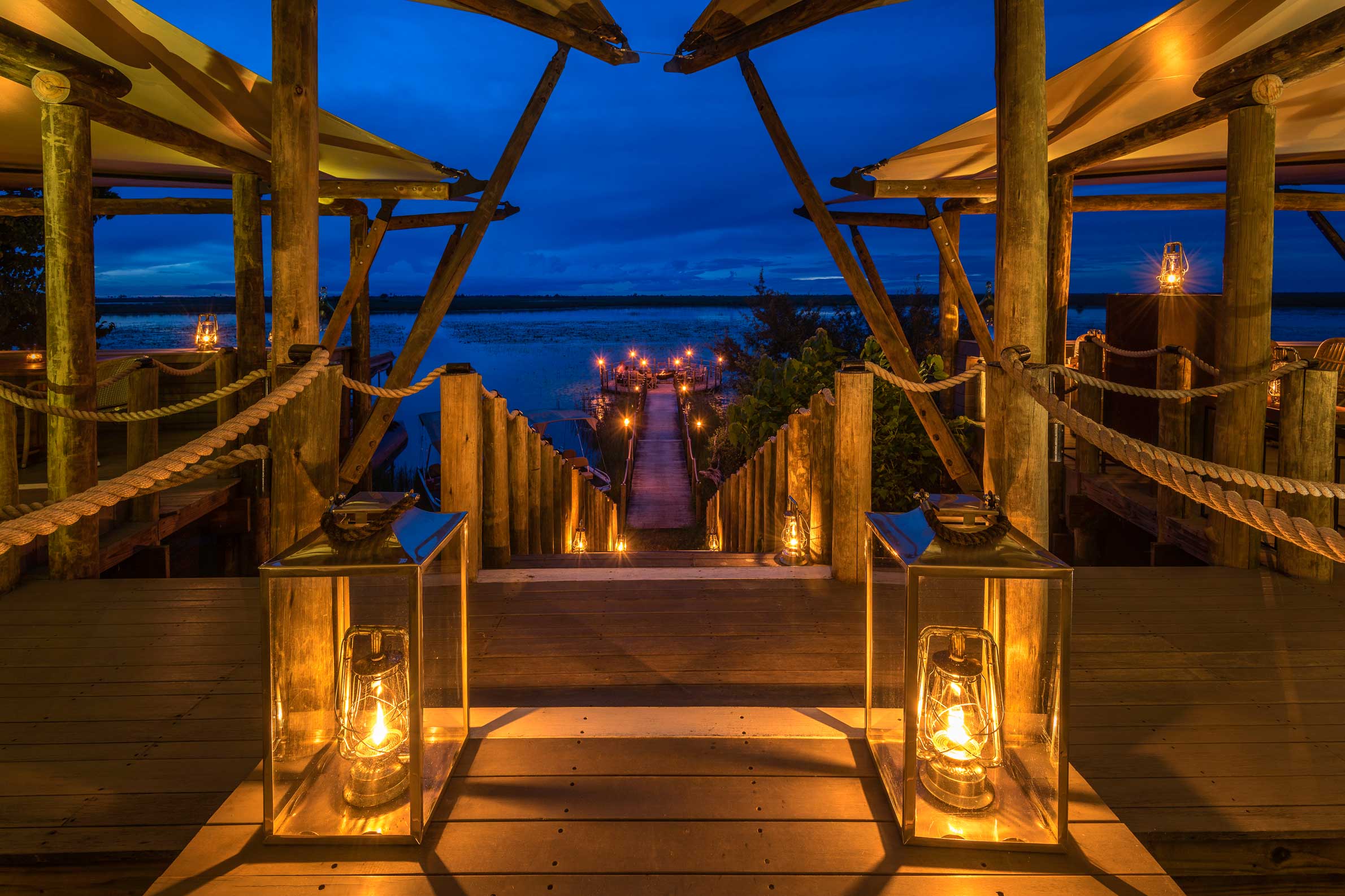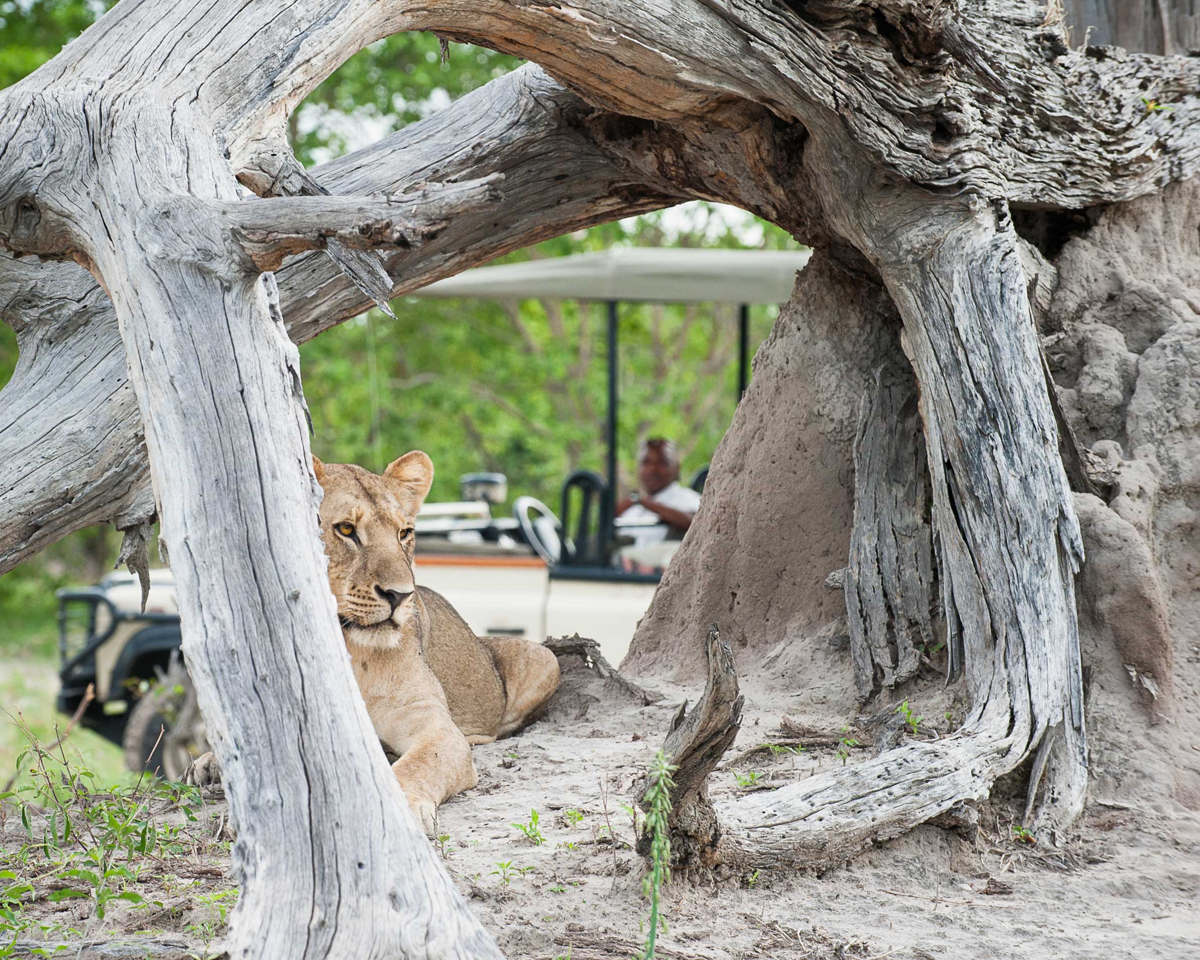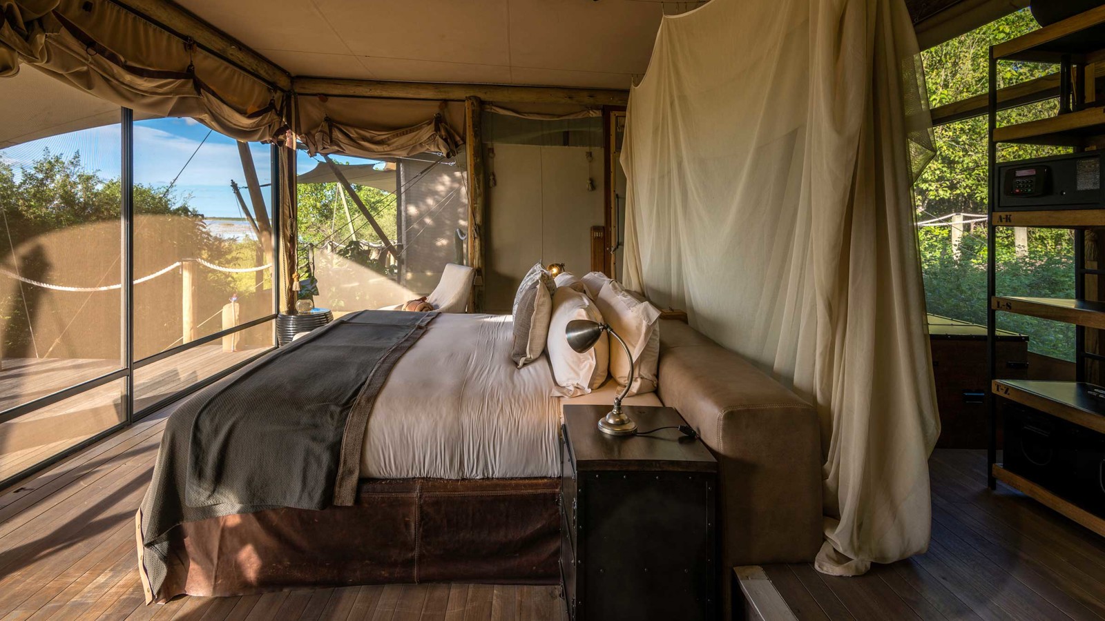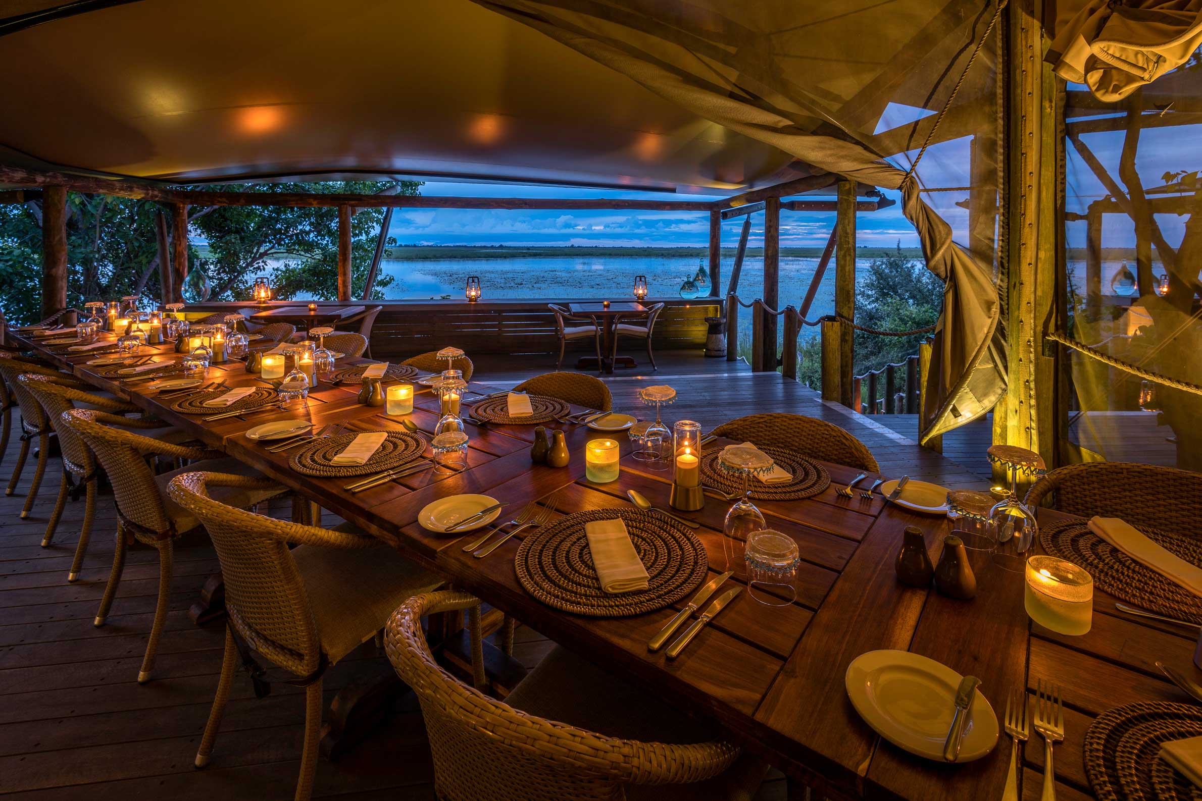Duma Tau betyder passande nog ”rytande lejon” och ligger mellan två elefantkorridorer vid en lagun mellan floderna Savute och Linyanti i ett privat Wildlife Reserve som gränsar till nationalparken Chobe. Campen ligger på ett upphöjt däck för den fantastiska utsiktens skull där var och en av de tio tältsviterna har ett privat utsiktsdäck. Sviterna har heltäckande ”fönster” i tältduken så att du kan ligga i den underbara dubbelsängen och följa djurlivet vid flodkanalen. Inredningen är varm och rustikt mysig i subtila savannfärger. Loungedelen av campen har en stor och luftig matsal och en pool med soldäck och utsikt över lagunen. Nedanför matplatsen al fresco finns en lägerhelt på marken för nattliga berättelser och en sängfösare. Området är känt för sin stora koncentration av elefanter men även giraff, buffel och vårtsvin hör till de vanliga besökarna. Dessutom är rovdjur som lejon, gepard, fläckig hyena och leopard inte ovanliga. Runt Duma Tau finns plattformar vid utmärkta spaningsplatser där man kan jaga det perfekta fotot. Den bästa vinns vid Suvatekanalens källa där stora örnar och andra rovfåglar är vanliga.