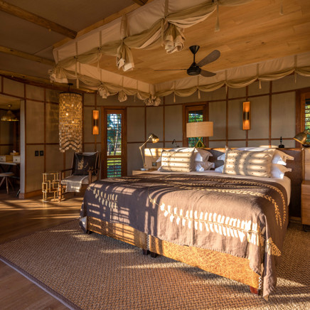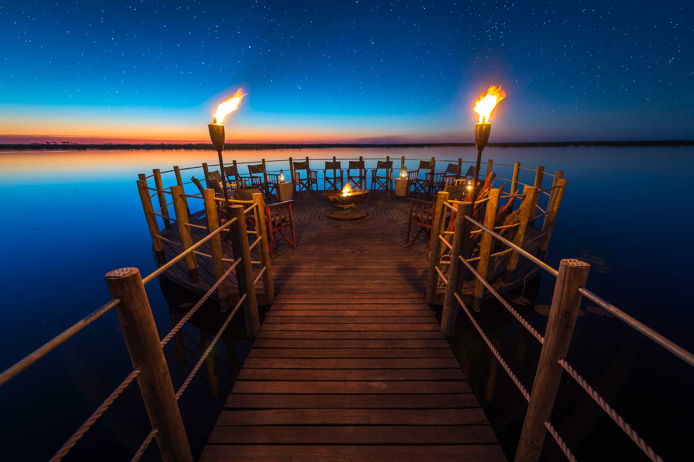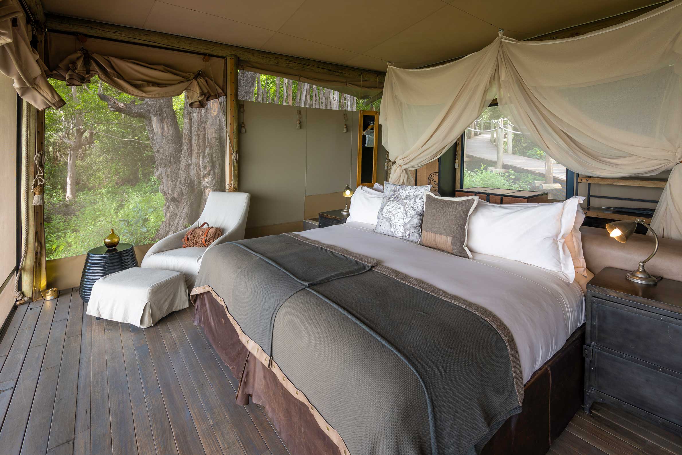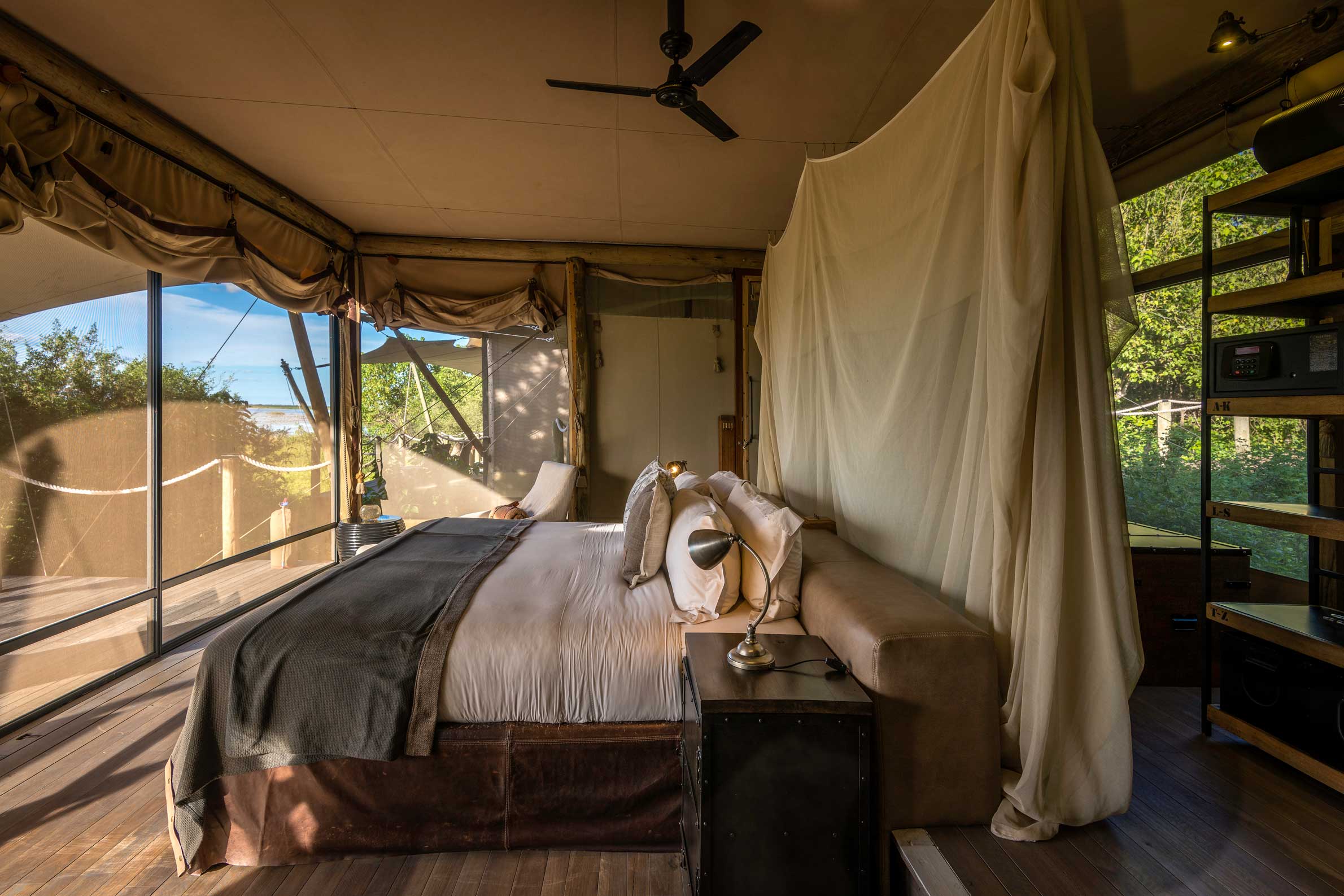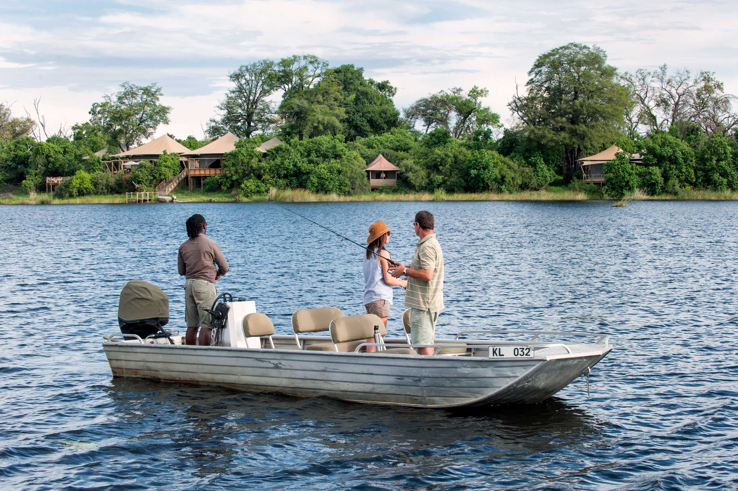Duma Tau betyder passande nog ”rytande lejon” och ligger mellan två elefantkorridorer vid en lagun mellan floderna Savute och Linyanti i ett privat Wildlife Reserve som gränsar till nationalparken Chobe. Campen ligger på ett upphöjt däck för den fantastiska utsiktens skull där var och en av de tio tältsviterna har ett privat utsiktsdäck. Sviterna har heltäckande ”fönster” i tältduken så att du kan ligga i den underbara dubbelsängen och följa djurlivet vid flodkanalen. Inredningen är varm och rustikt mysig i subtila savannfärger. Loungedelen av campen har en stor och luftig matsal och en pool med soldäck och utsikt över lagunen. Nedanför matplatsen al fresco finns en lägerhelt på marken för nattliga berättelser och en sängfösare. Området är känt för sin stora koncentration av elefanter men även giraff, buffel och vårtsvin hör till de vanliga besökarna. Dessutom är rovdjur som lejon, gepard, fläckig hyena och leopard inte ovanliga. Runt Duma Tau finns plattformar vid utmärkta spaningsplatser där man kan jaga det perfekta fotot. Den bästa vinns vid Suvatekanalens källa där stora örnar och andra rovfåglar är vanliga.