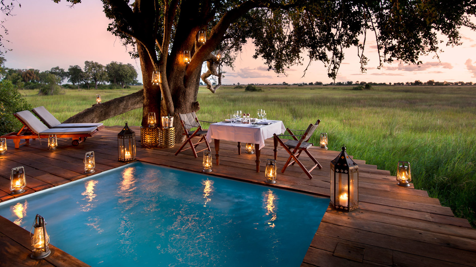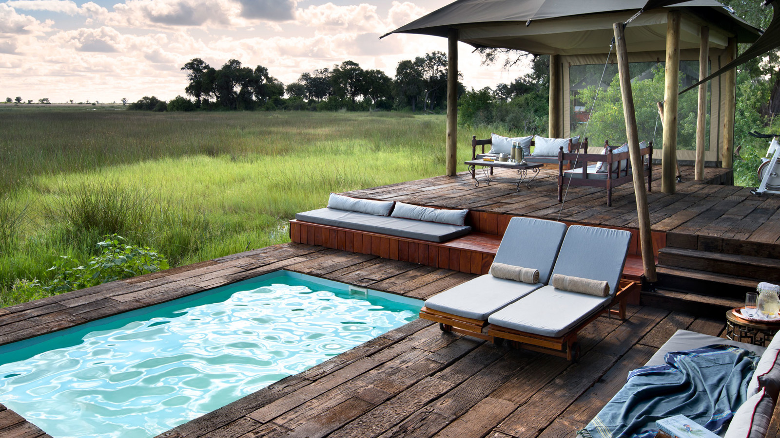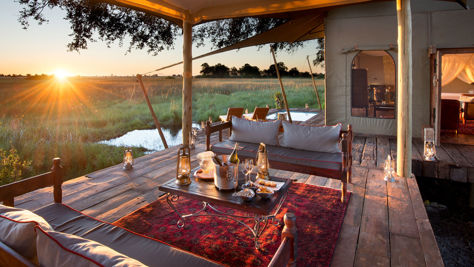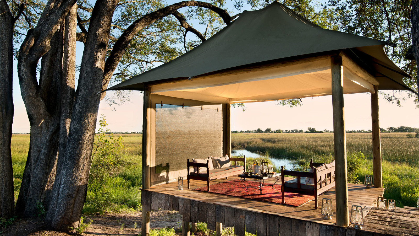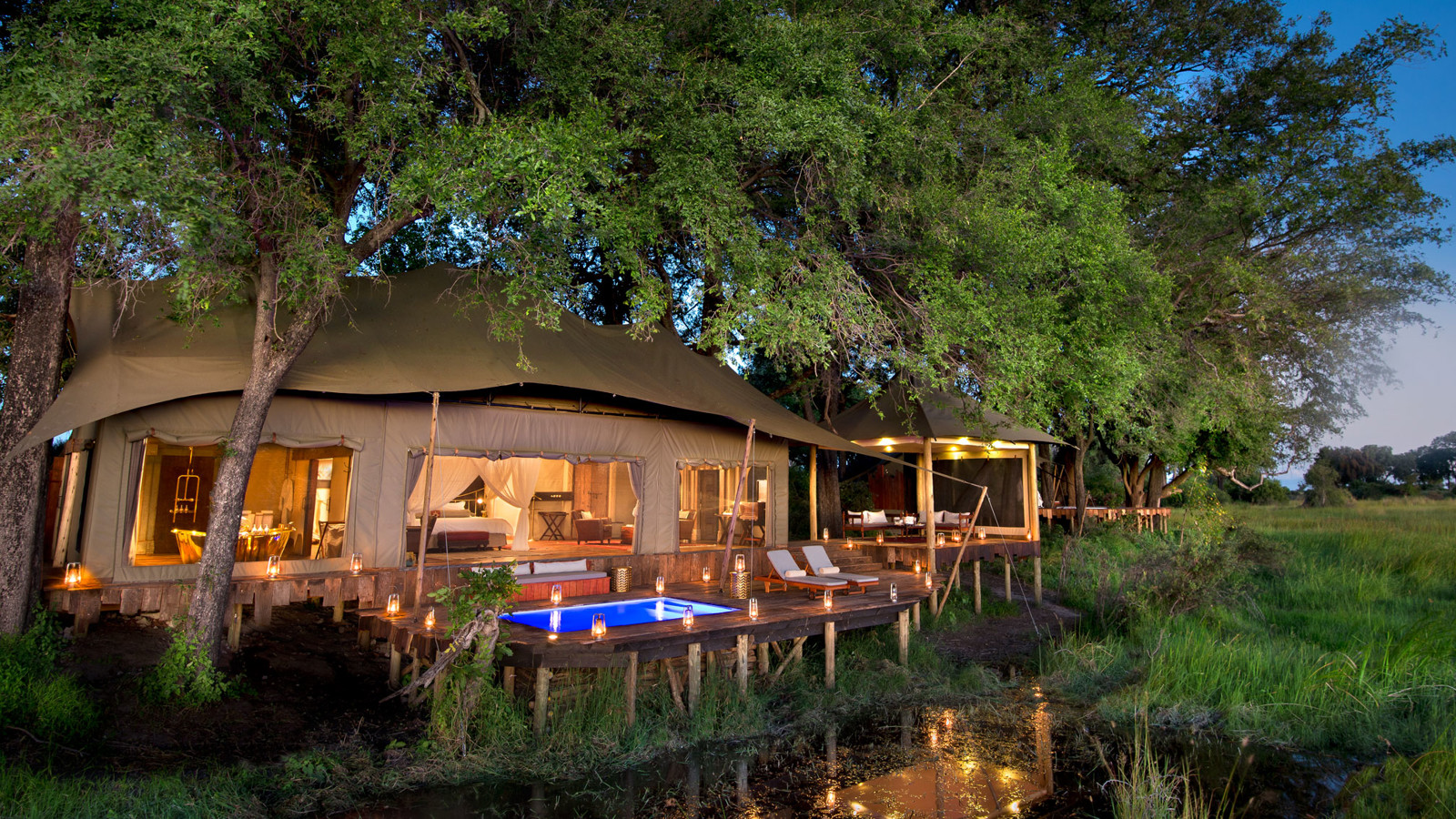 Duba Plains Camp ligger i en avlägsen del av Okavangodeltat där lejon och buffel fortfarande är betydligt vanligare än människor i öppna safarijeepar. De sju rymliga sviterna med väggar av kanvasväv i denna exklusiva safaricamp ligger på en ö i den stora privata koncessionen Kwedi, där ebenholts-, fikon- och mangostanträd bjuder på en svalkande skugga. Alla sviterna är inredda i klassisk safaristil, har uteduschar och en veranda med panoramavy över Okavangos vattenslätter, samma utsikt som från den stora och smakfulla loungen och det upphöjda pooldäcket. Är du en familj eller 2 par som reser tillsammans, finns exklusiva The Dhow Suite med 2 sovrum, egen butler, kock och jeep. Den fotointresserade har många möjligheter till fantastiska foton då två konkurrerande lejonflockar ofta jagar bufflar nära campen och i de djupare kanalerna trivs flodhäst. Här syns även hyenor, gnu, vattenbocken letje och det fantastiska fågellivet är imponerande.