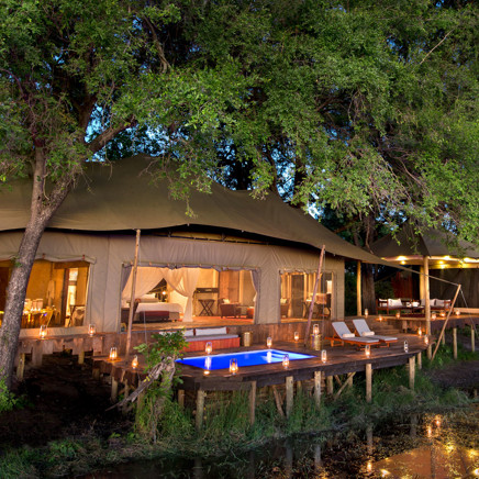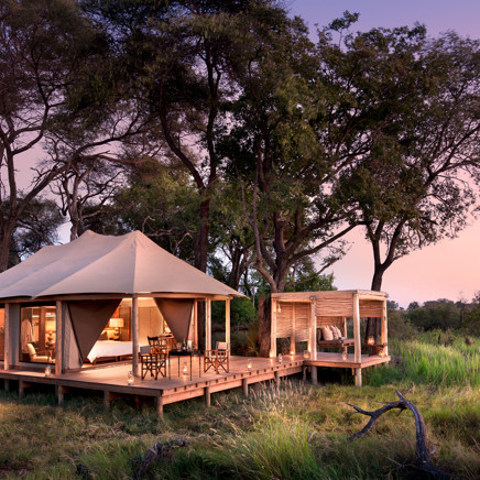 Under trädkronorna vid kanten av floden Khwai ligger vackra Khwai Leadwood Camp. Här är floden allt som skiljer det exklusiva ekolägret från ikoniska nationalparken Moremi Game Reserve, ”rovdjurens huvudstad” så bli inte förvånad om du ser flodhästar och elefanter i vattenbrynet redan medan du smuttar på morgonkaffet. Djurlivet just här anses vara det bästa i hela Södra Afrika. Under dagen väljer du mellan game drives, safari till fots och i traditionell mokorokanot där du enkelt glider förbi en sömnig flodhäst och når platser dit lejonen smyger sig ned för att dricka. En bonus med området är också möjligheten att följa med på nattsafari och komma riktigt nära Afrikas nattaktiva och mer svårhittade djur, till exempel leopard, piggsvin och honungsgrävling. De sju rymliga och toppdesignade tältsviterna kommer all nödvändig och tänkbar komfort för den ultimata upplevelsen. Du bor med stor dubbelsäng, fullt utrustat badrum, eget uterum och tillgång till en svalkande pool på första parkett intill floden. Maten är en upplevelse i sig och serveras antingen i den luftiga matsalen al fresco eller på en mer intim plats under stjärnhimlen ackompanjerat av nattdjurens ljudliga läten.
