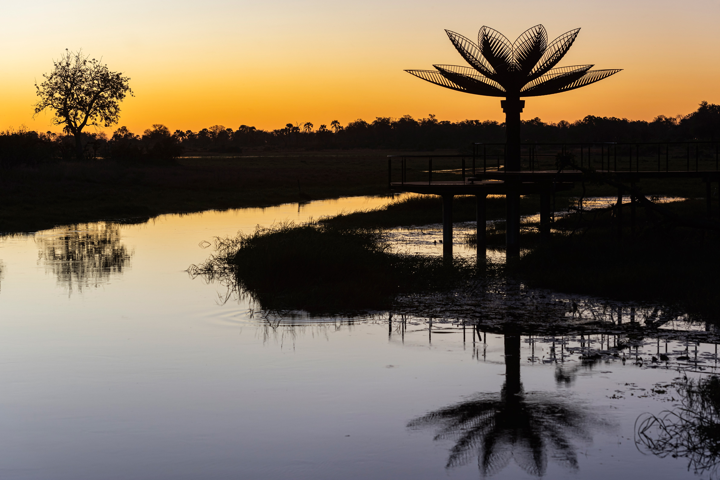 Xigera Safari Lodge med sina 12 vackert dekorerade sviter erbjuder en upplevelse utan motsvarighet. Här blandas naturskön vildmark och artrikt djurliv med vackra konstverk av välrenommerade afrikanska konstnärer, genom lodgens unika samarbete med konstgalleriet Southern Guild. Inredningen på denna nyrenoverade lodge speglar den afrikanska kulturen och lokala hantverkstraditioner. Inredningsdetaljer, textiler och andra material är noga utvalda och av högsta kvalitet. De luftkonditionerade sviterna är mycket och erbjuder stor plats både inne och ute genom sitt spatiösa trädäck med utsikt över vattendraget nedanför. Spa, vinkällare, pool och konstgalleri är annan lyx som erbjuds de max 24 gästerna. Xigera Safari Lodge är beläget i Moremi Game Reserve i hjärtat av Okavangodeltats rika flodsystem. Här finns rikliga mängder av elefanter, bufflar och antiloper av olika slag. Även kattdjur som lejon och leopard är vanliga i området och kring själva lodgen. Är du fågelskådare så har du kommit till ditt paradis! Ovanliga arter som afrikansk fiskuggla, afrikansk saxnäbb, dvärgjacana m.fl. är vanligt förekommande här. Vi gillar extra mycket upplevelsen av att sova under stjärnorna i Xigeras lyxiga trädkoja 10 meter ovan marken!
