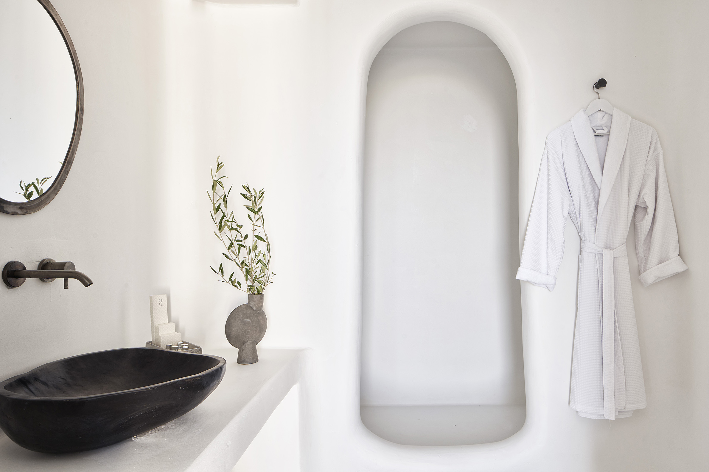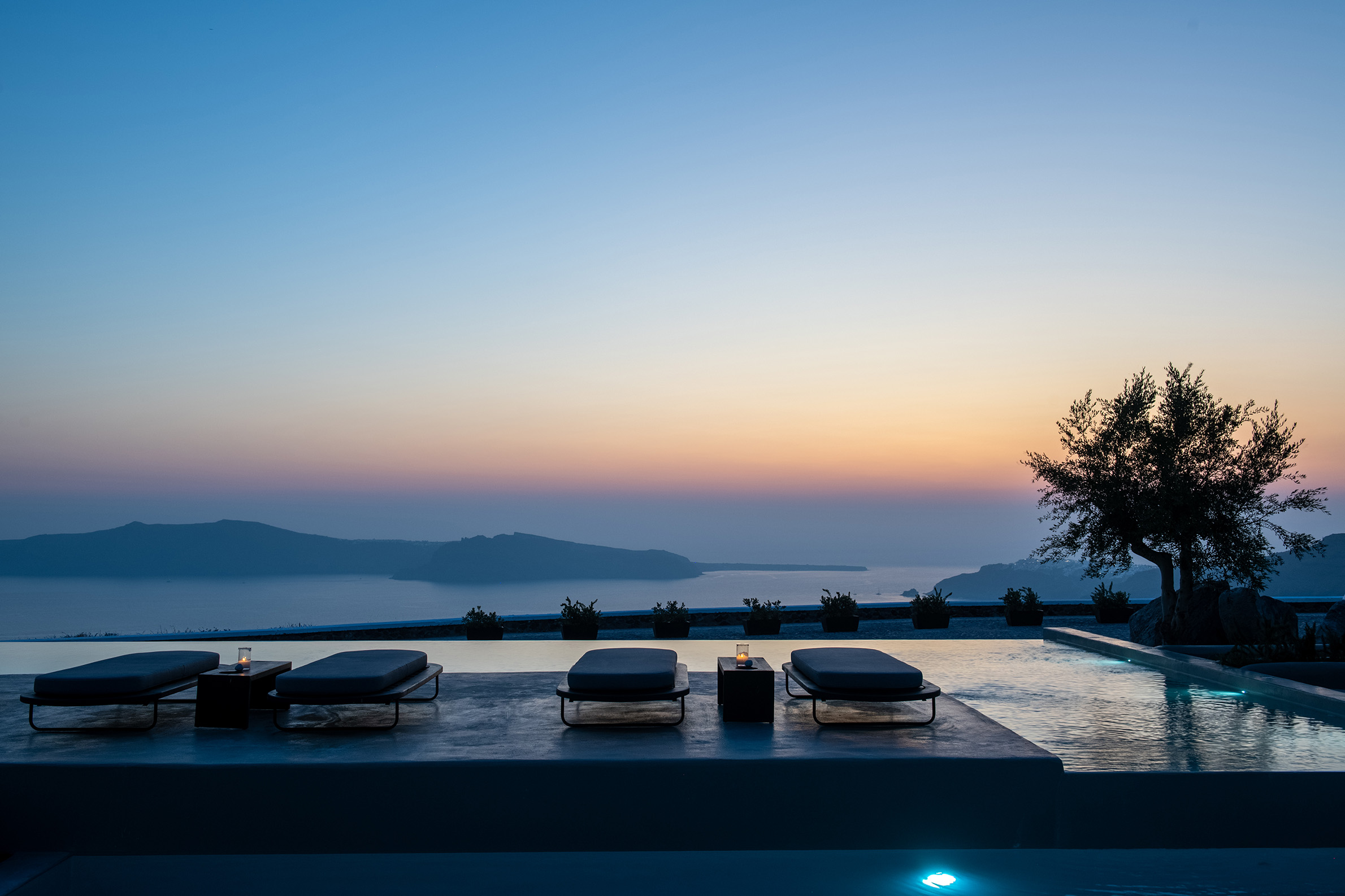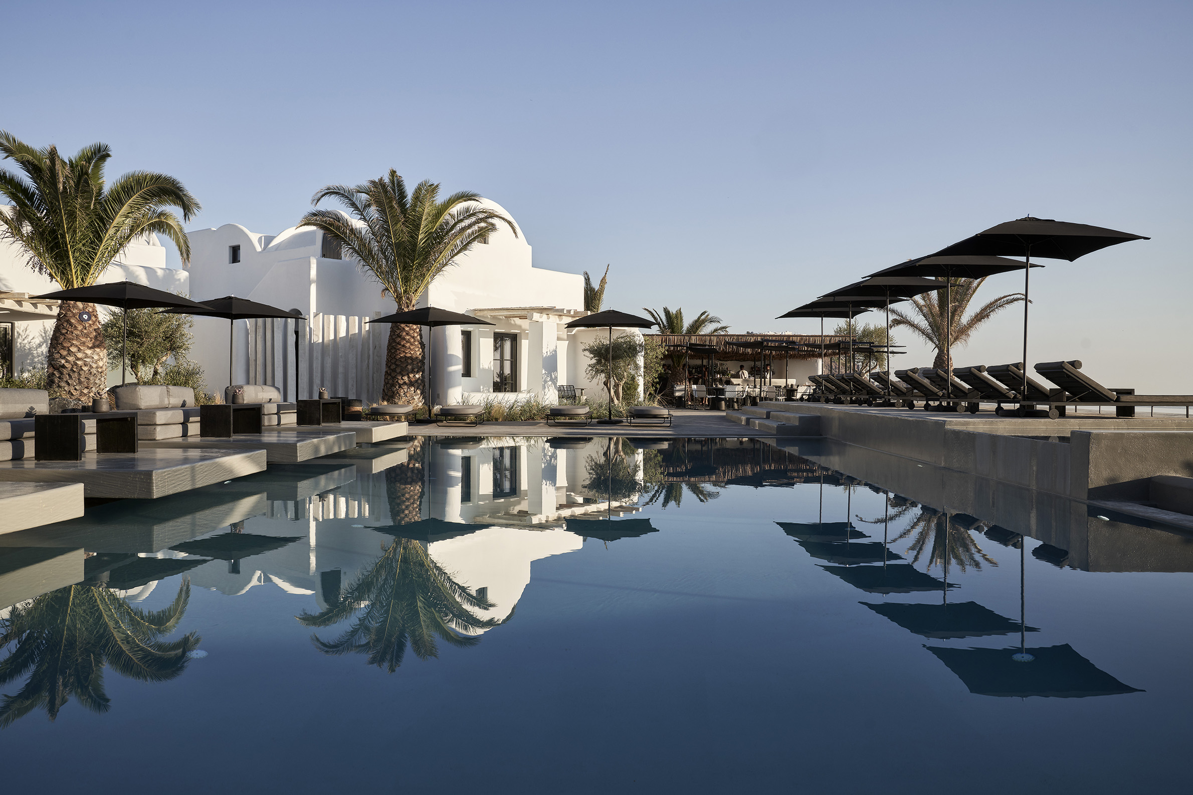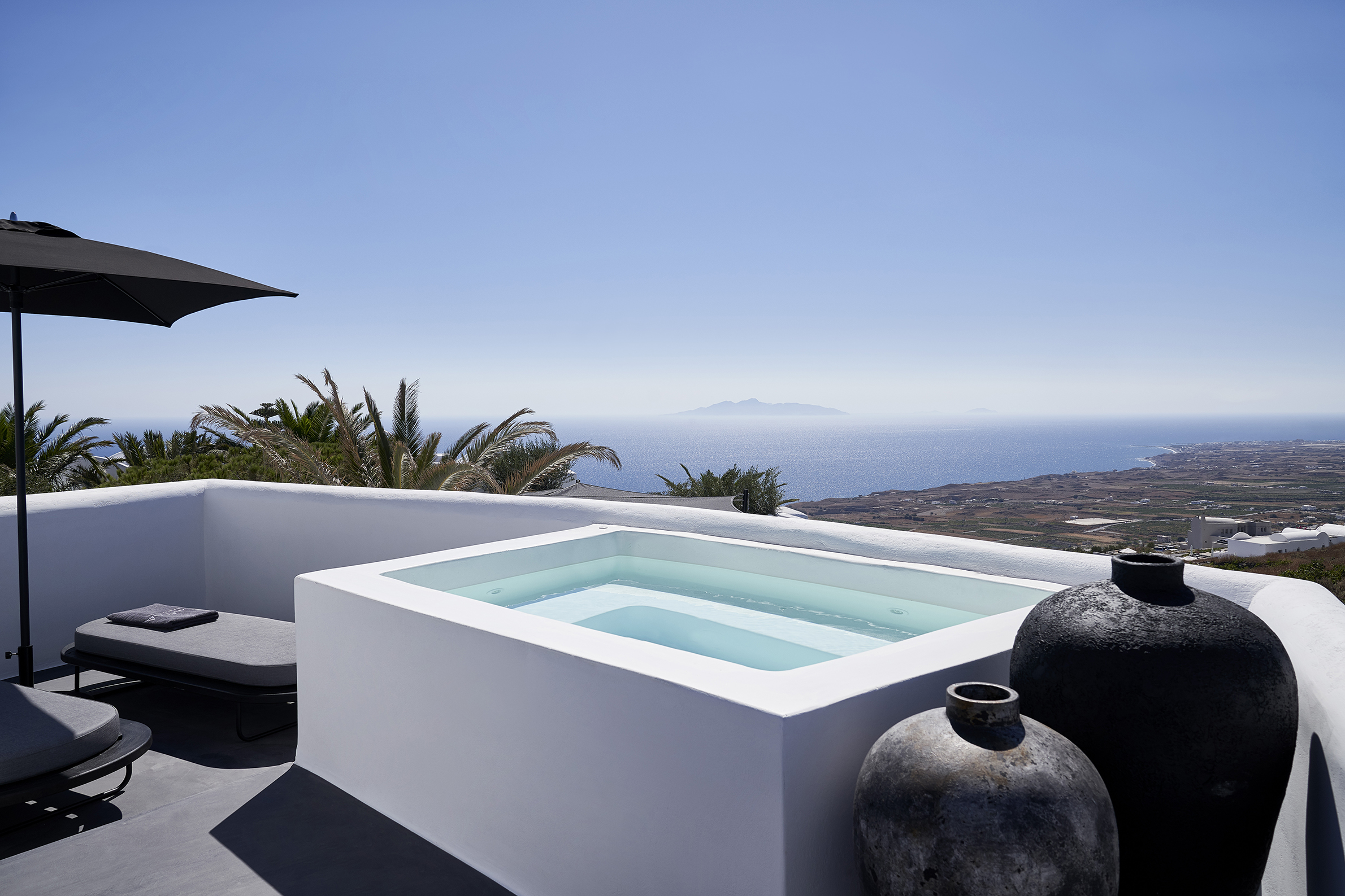Nobu Santorini vinglar på kraterkanten av högt belägna Imerovigli. Hela byn går i vita och grå färger med stänk av lysande blå pooler. Här har souvenirförsäljarna hållits i hårda tyglar och tavernorna smälter snyggt in i omgivningen. Dessutom är det bara tjugo minuters hänförande promenad till den kommersiella huvudorten Fira. Upplevelsen av solnedgången i havet från en av Nobu Santorinis privata balkonger med jacuzzi kan ge den mest hårdhudade romantiska rysningar. Sviterna och villorna som påminner om rundade kuber av fetaost, är inredda i japansk-minimalistisk stil. De kritvita väggarna har mjukats upp med varma trämöbler, dämpade linnetyger, vacker keramik och konst, gjord av lokala hantverkare. Badrummen har handfat i svart lavasten och bekväma kimonobadrockar. Varje spatiös villa sprider ut sig på två våningar och kommer med privat trädgård, pool, lyxiga badrum och panoramavy över havet. Utöver att titta varandra i ögonen när det lokala vinet från den bördiga lavajorden slinker ner, kommer de flesta gästerna förstås hit för maten. Frukosten, som serveras på terrassen med utsikt över havet, går att få som traditionell engelsk eller en mer hälsosam variant. Den senare inkluderar bland annat färskpressade juicer, lokal grekisk yoghurt med timjanhonung och bovetemüsli, chiapudding med mangogel och kokoschips samt en japansk twist på äggröra. Nobus middagsupplevelse är fullkomligt fantastisk – gulfenad sashimi, wagyudumplings, sushi och misomarinerad, svart torskfilé. Du får bokstavligen hålla dig från att slicka rent tallriken. På cocktailmenyn finns en myriad av innovativa japanskinfluerade drinkar som gifter sig fint med den glödande solnedgången. Nobu Santorini välkomnar gäster från 14 år.