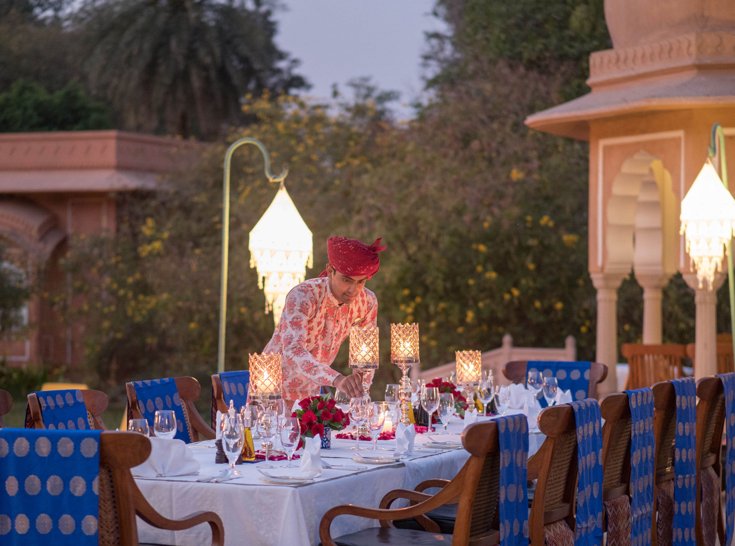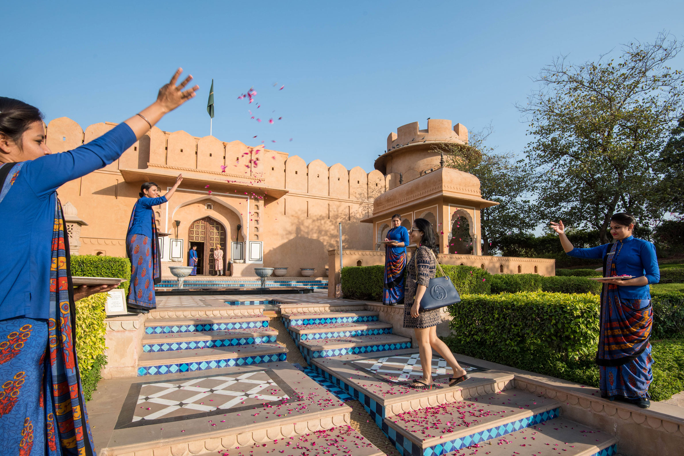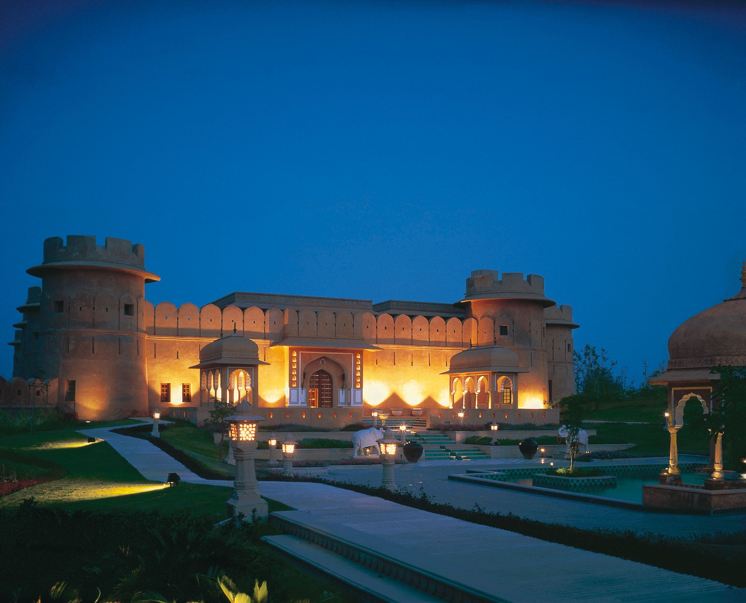 I hjärtat av Rajasthan och alldeles i närheten av den spännande staden Jaipur ligger detta romantiska hotell. Välansade trädgårdar med porlande fontäner och frodig grönska omringar den mäktiga arkitekturen av pelare, kolonner och stämningsfulla paviljonger. Boendet är exklusivt, i en stil som minner om den legendariska prinsessan Rajput. Smakfull inredning med hög komfort, nedsänkta badkar i marmor och lyxiga detaljer gör vistelsen extra behaglig. För ett mer exotiskt boende finns läckra, luftkonditionerade tältvillor.