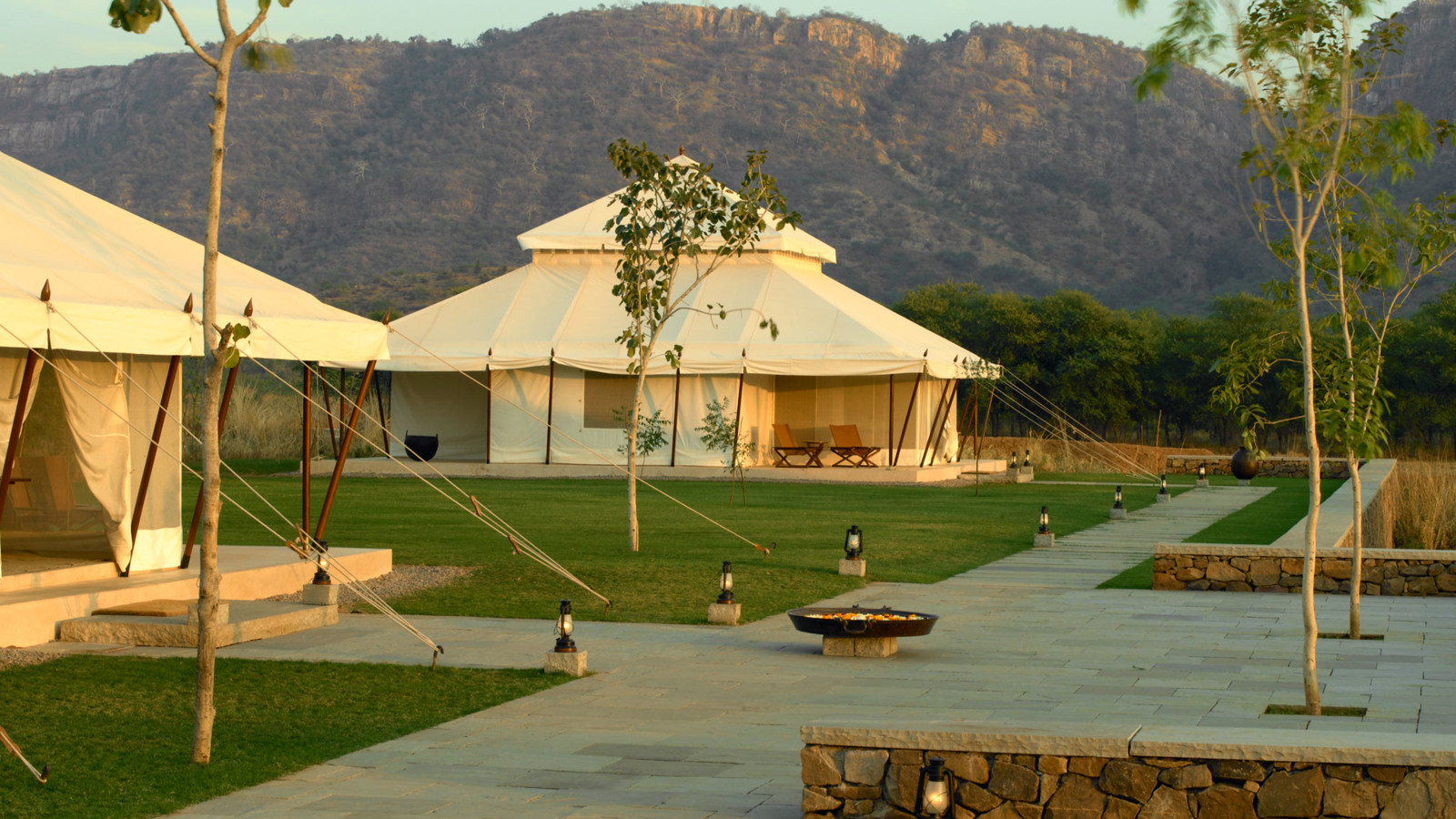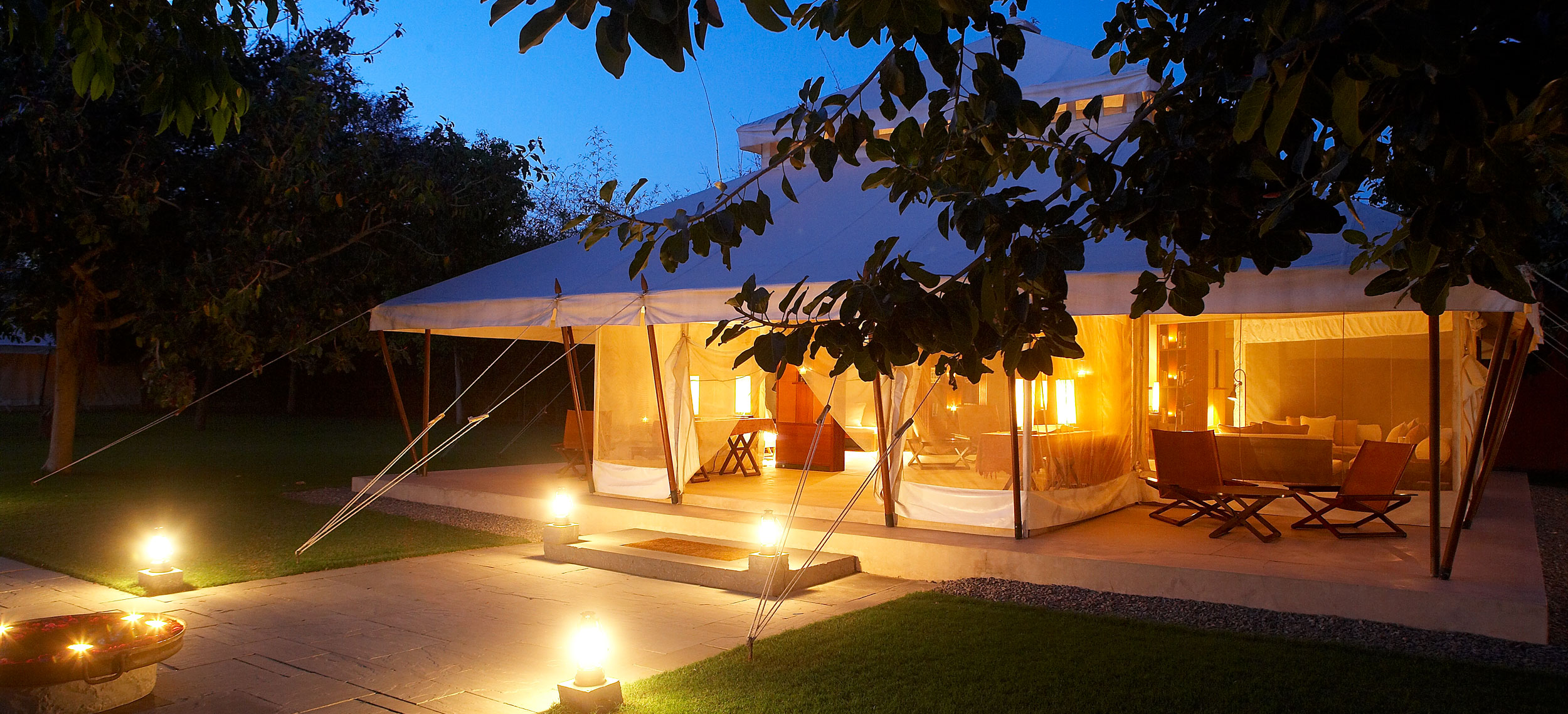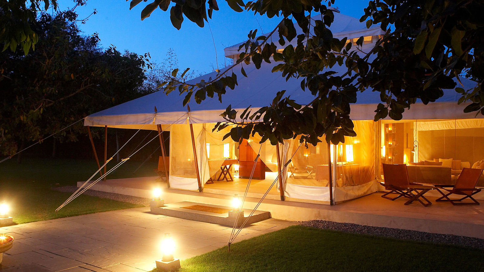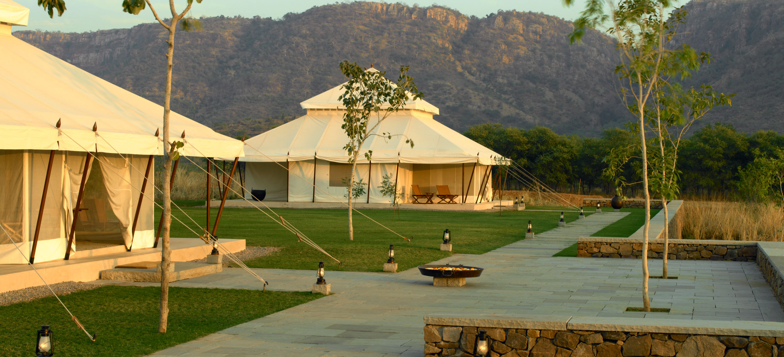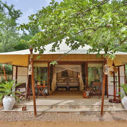 Aman-i-Khas, hindi och urdu för ”speciell” är verkligen något utöver det vanliga. Det är tio kanvasklädda tältsviter i utkanten av Rajasthans stora fristad för vilda djur - nationalparken Ranthambore. Tälten i kolonial safaristil med vacker färg och inredning i läder och linne ligger runt den stora eldstaden som är lägrets givna samlingsplats. Aman-i-Khas ligger nära ett vattenhål dit vilda djur kommer för att dricka och två gånger om dagen arrangeras safariturer med kunniga guider i jakt på den stora bengaliska tigern, leoparder, hyenor, krokodiler och chital. De luftiga tältsviterna har höga baldakiner och separat sov-, dressing- och badrum. Tältsviterna erbjuder stora sängar, inbjudande dagbäddar, badkar i marmor och handgjorda möbler i teak och bomullstyger i en ton av crème. Varje tält har privat butlerservice. Vill du vara extra privat rekommenderas tält nummer 1 som är beläget längst bort från lägret och är det tält där Katie Perry och Russell Brand valde när de firade sitt bröllop här. Köket serverar indiska och västerländska rätter med grönsaker odlade i den egna trädgården. Det finns även en lounge och ett spa där du njuter massage och andra behandlingar.