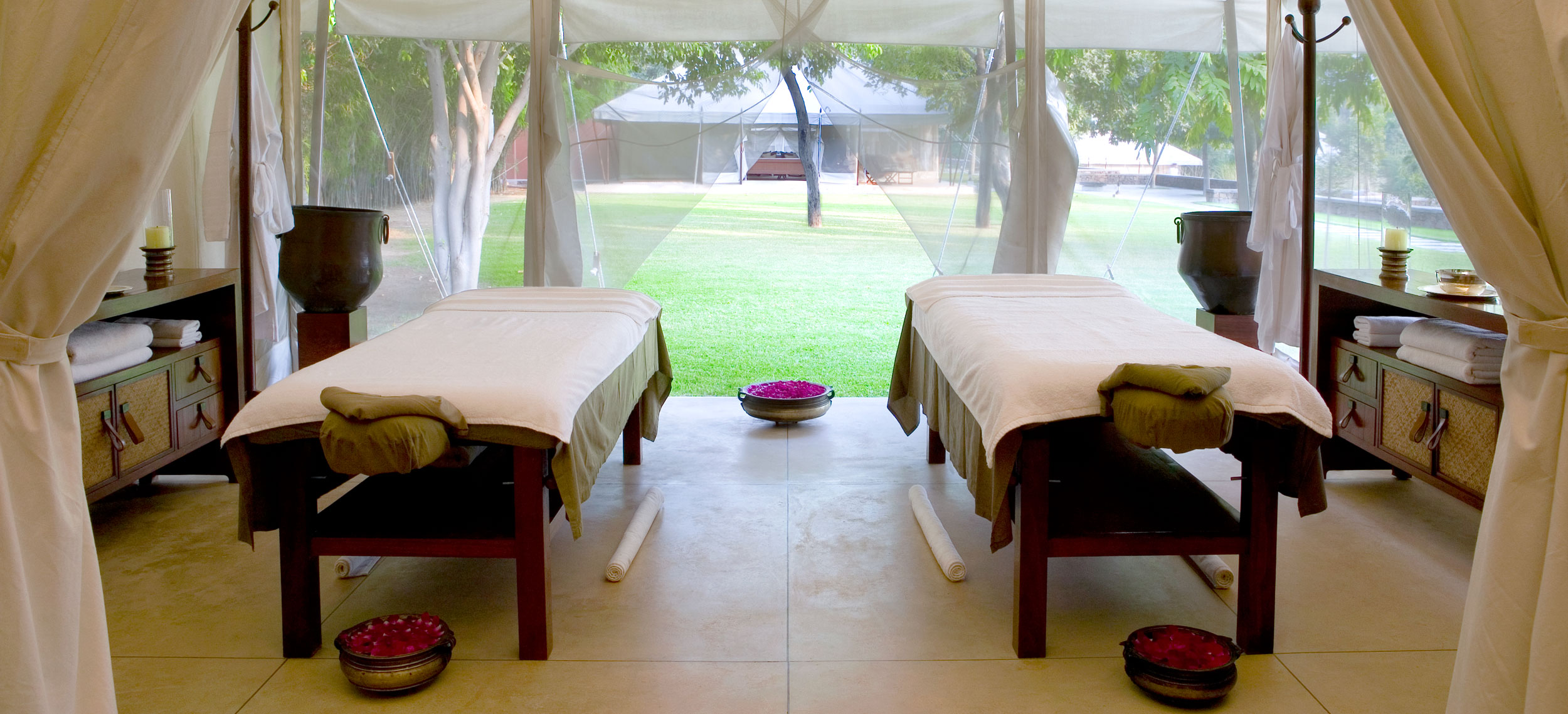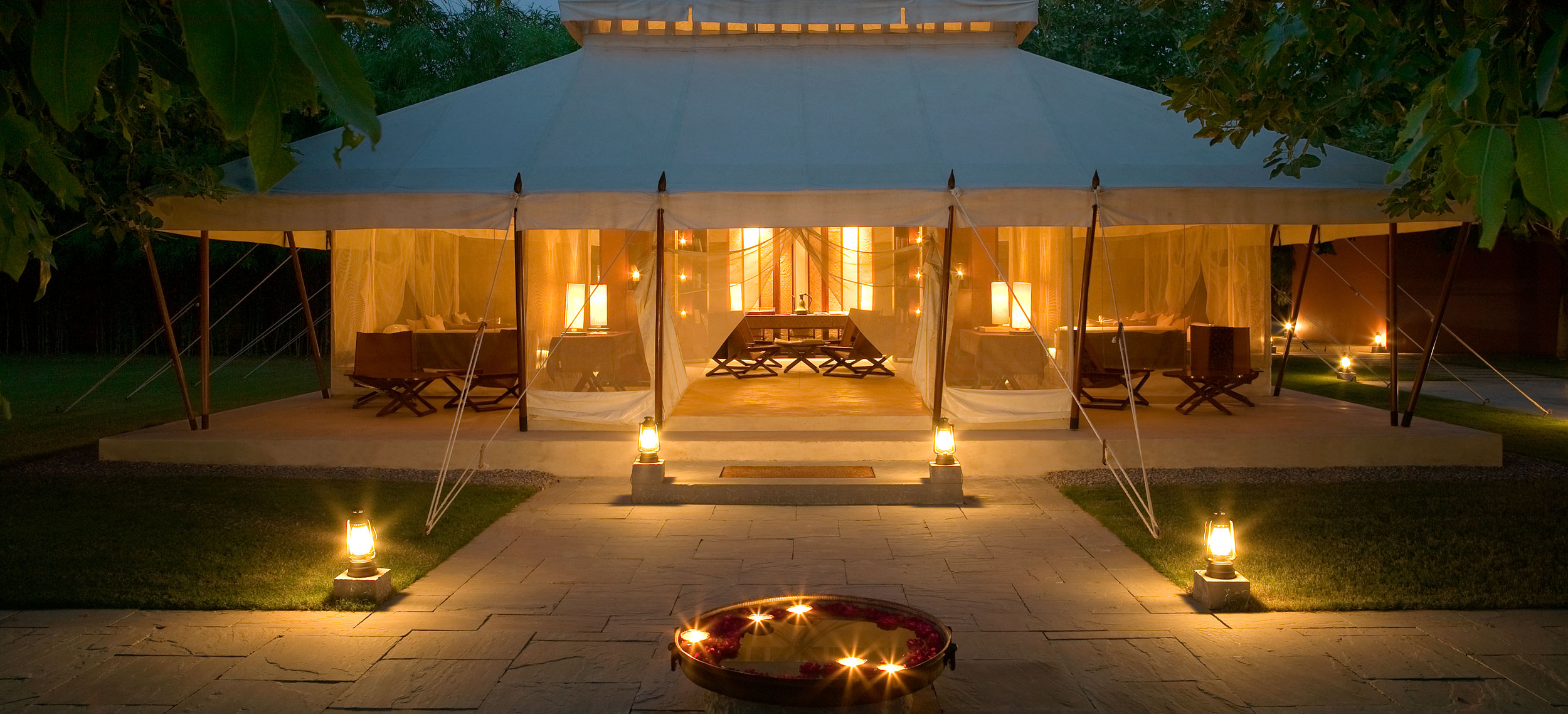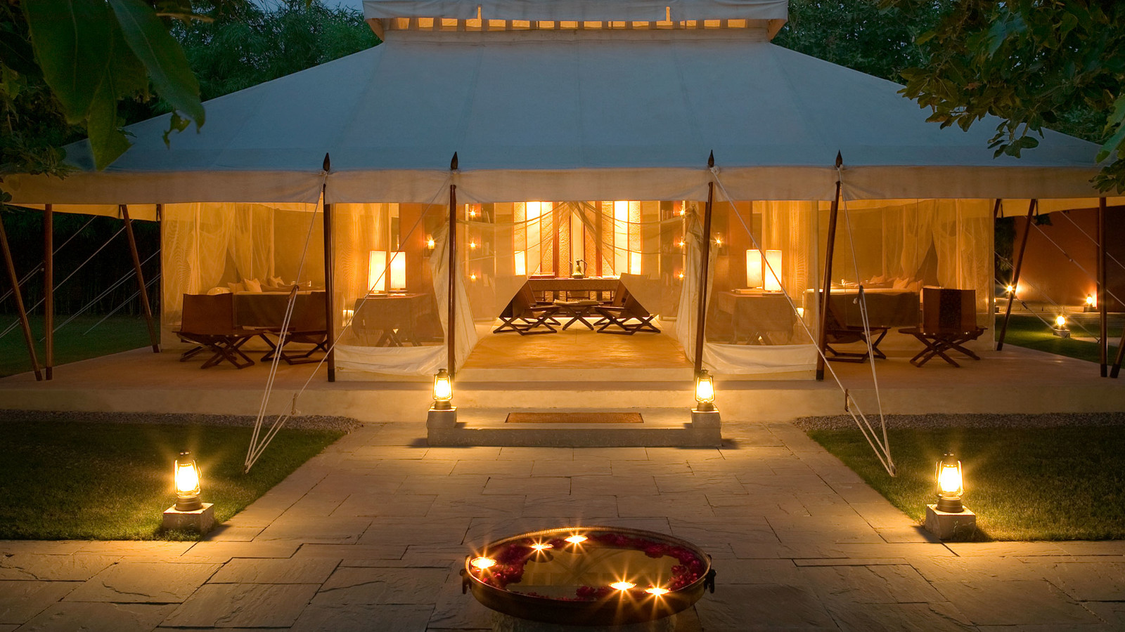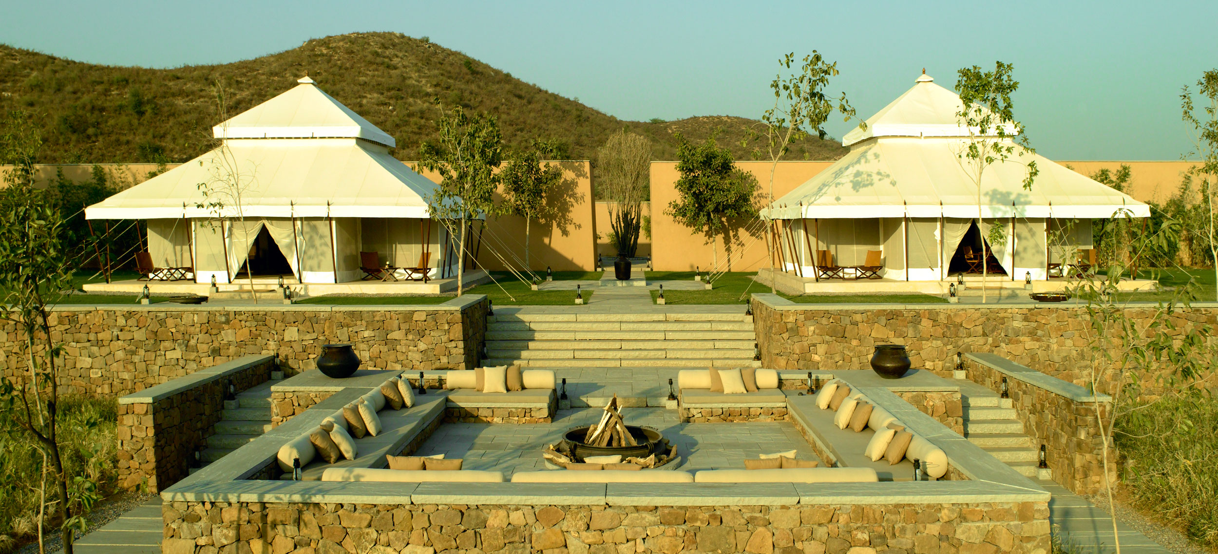 Aman-i-Khas, hindi och urdu för ”speciell” är verkligen något utöver det vanliga. Det är tio kanvasklädda tältsviter i utkanten av Rajasthans stora fristad för vilda djur - nationalparken Ranthambore. Tälten i kolonial safaristil med vacker färg och inredning i läder och linne ligger runt den stora eldstaden som är lägrets givna samlingsplats. Aman-i-Khas ligger nära ett vattenhål dit vilda djur kommer för att dricka och två gånger om dagen arrangeras safariturer med kunniga guider i jakt på den stora bengaliska tigern, leoparder, hyenor, krokodiler och chital. De luftiga tältsviterna har höga baldakiner och separat sov-, dressing- och badrum. Tältsviterna erbjuder stora sängar, inbjudande dagbäddar, badkar i marmor och handgjorda möbler i teak och bomullstyger i en ton av crème. Varje tält har privat butlerservice. Vill du vara extra privat rekommenderas tält nummer 1 som är beläget längst bort från lägret och är det tält där Katie Perry och Russell Brand valde när de firade sitt bröllop här. Köket serverar indiska och västerländska rätter med grönsaker odlade i den egna trädgården. Det finns även en lounge och ett spa där du njuter massage och andra behandlingar.