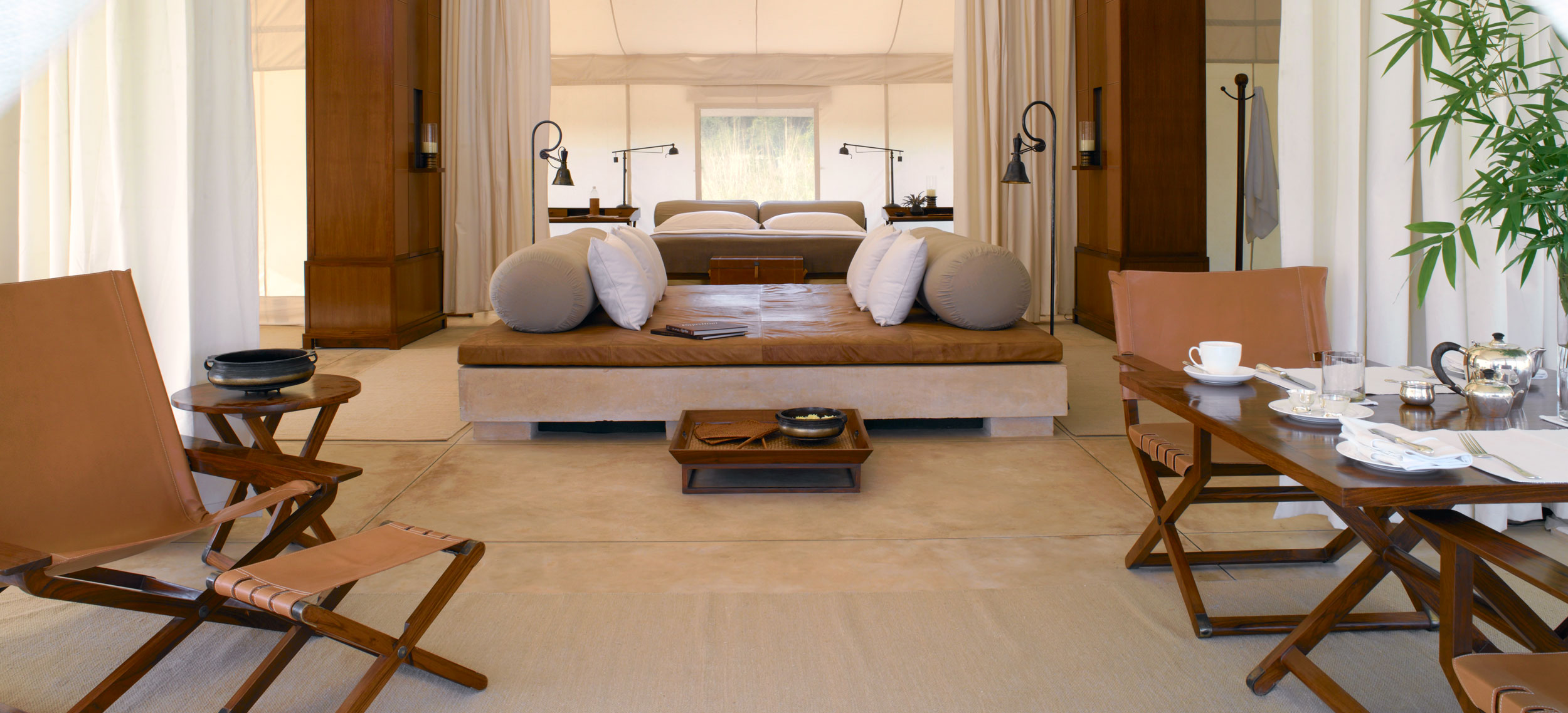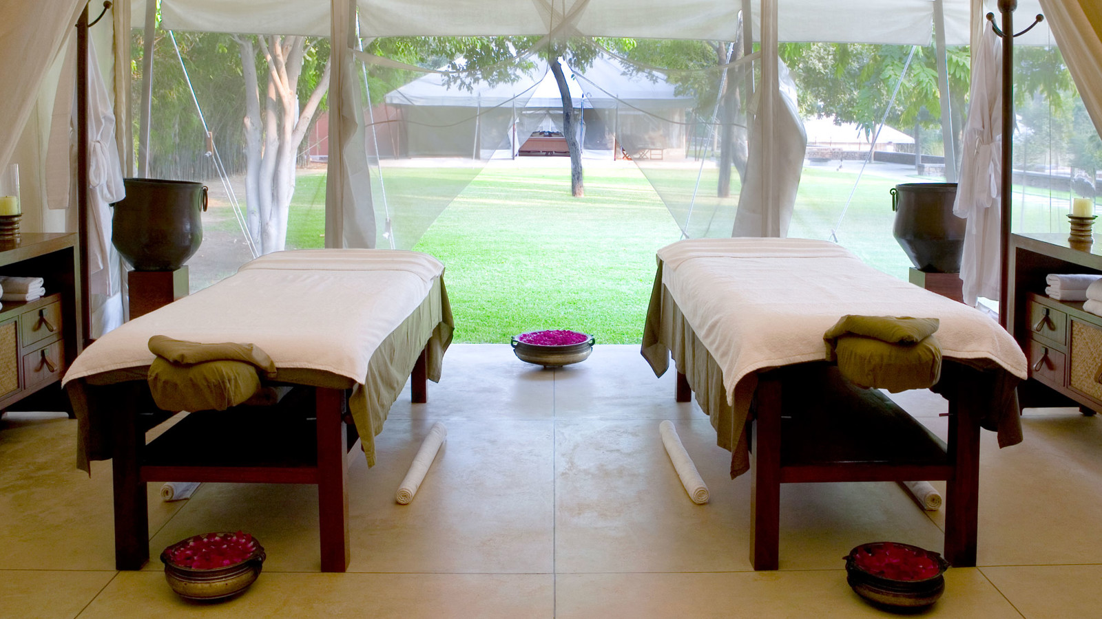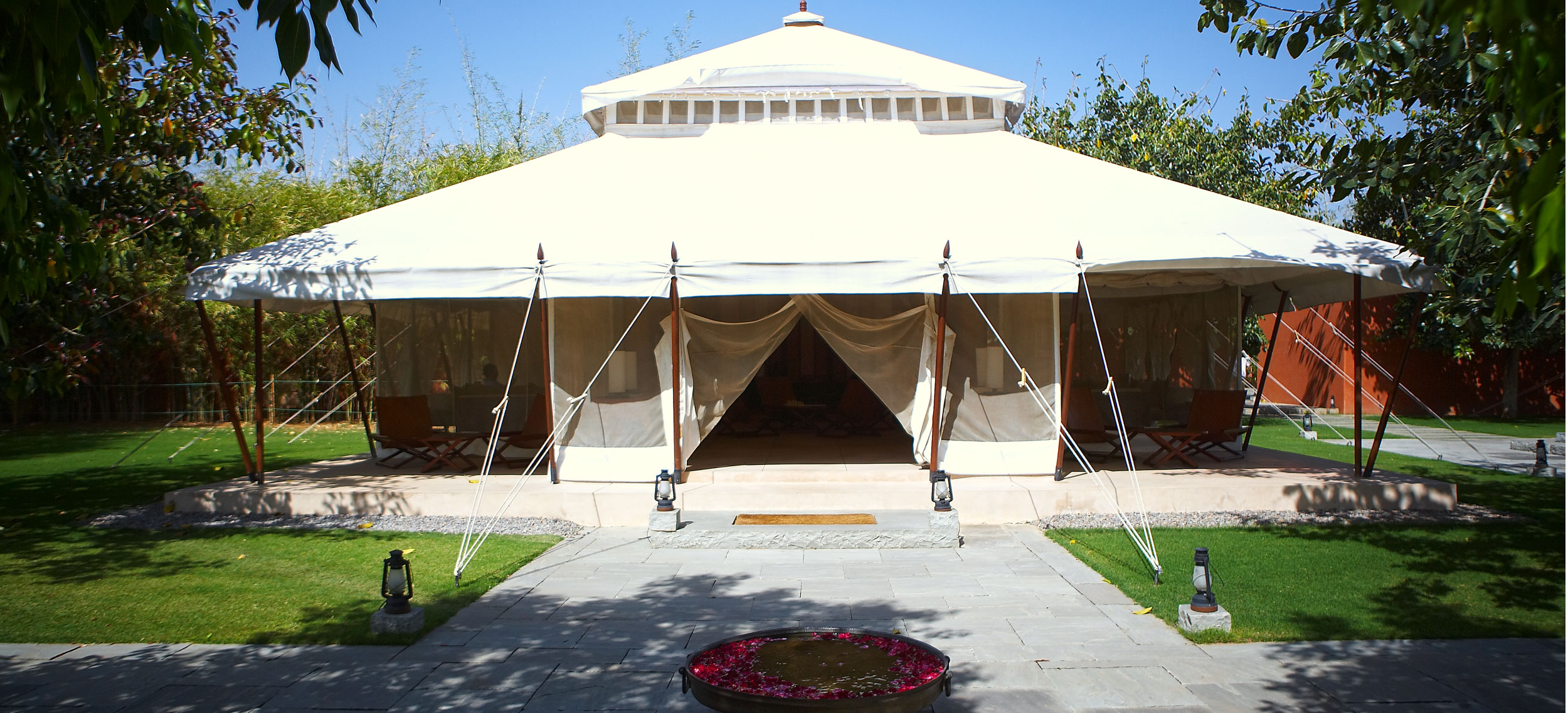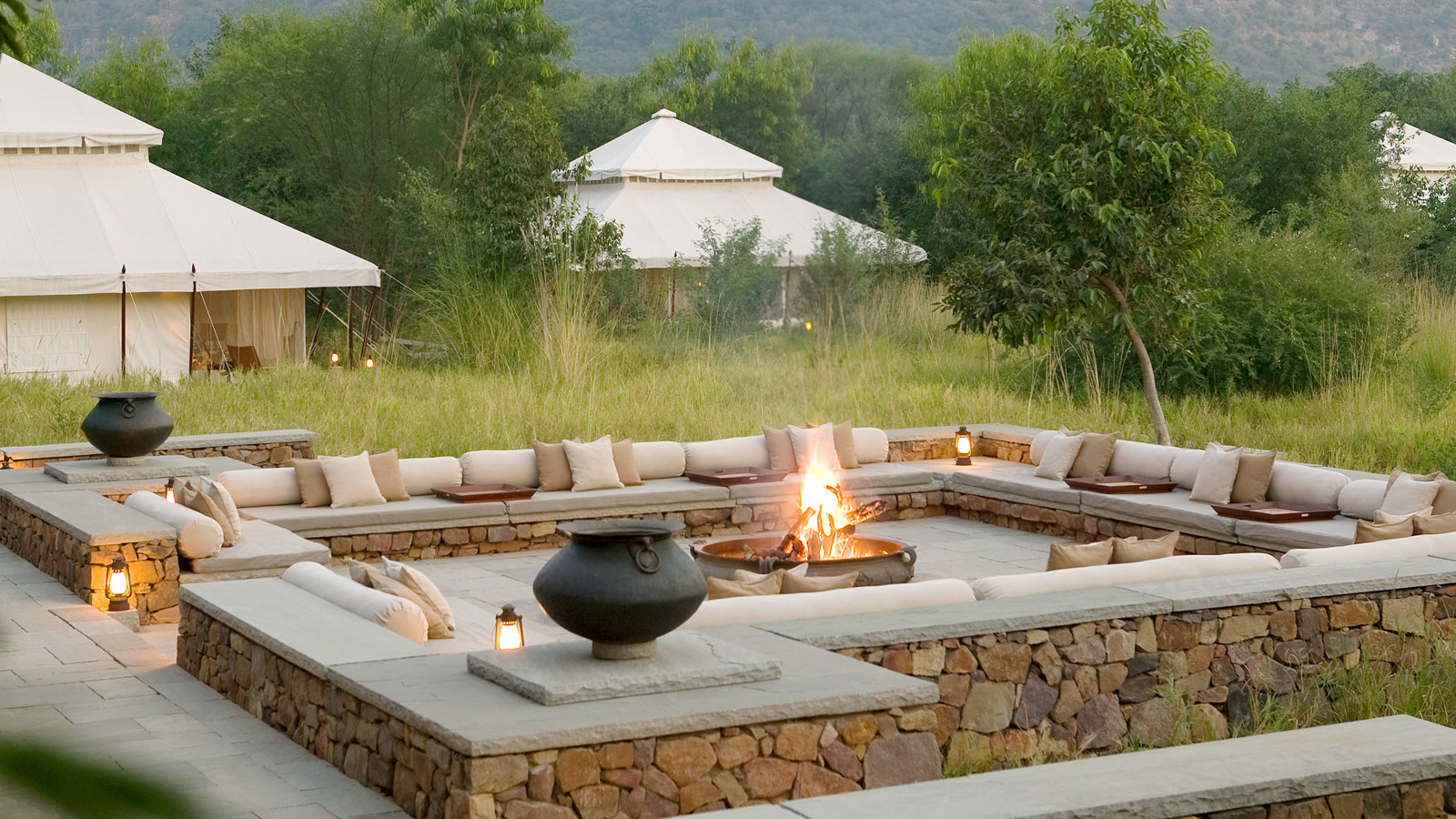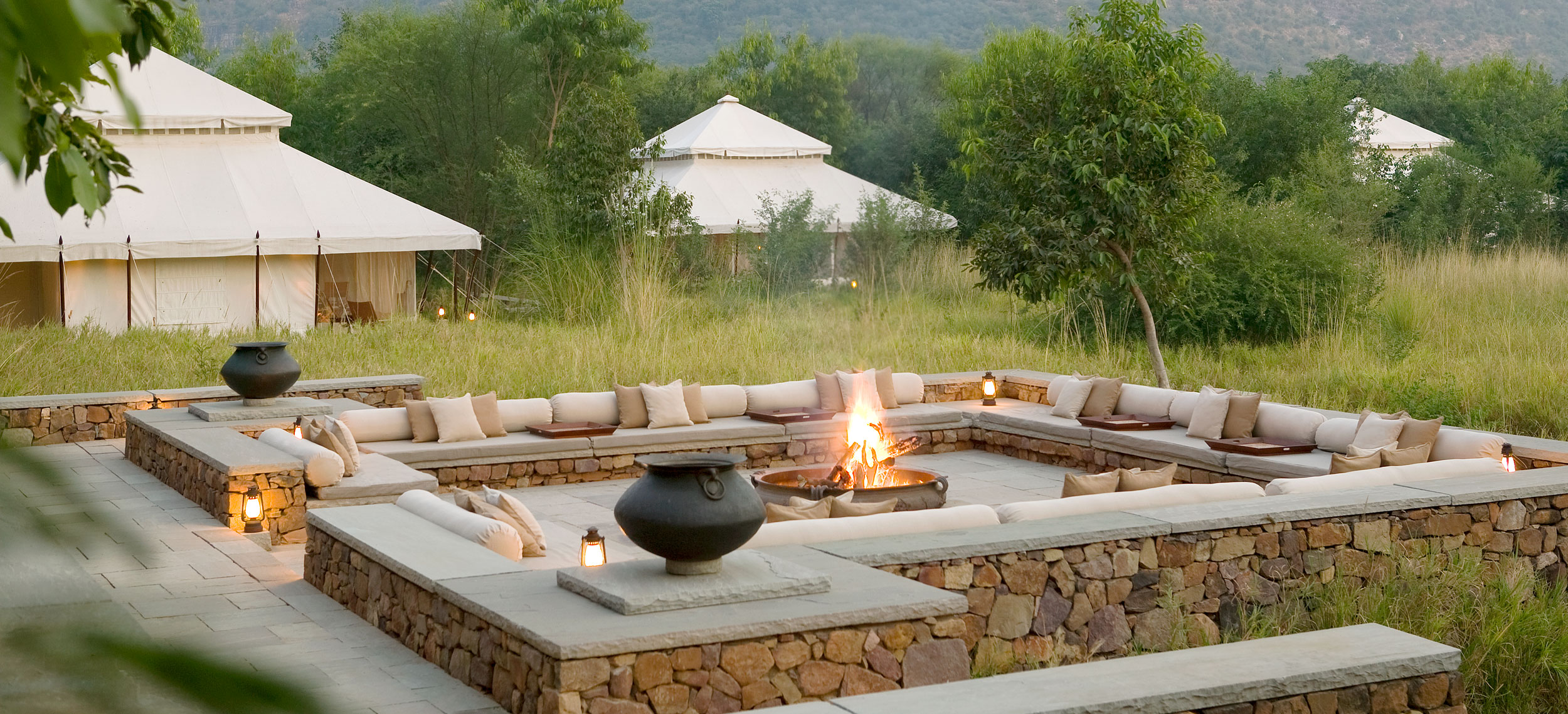 Aman-i-Khas, hindi och urdu för ”speciell” är verkligen något utöver det vanliga. Det är tio kanvasklädda tältsviter i utkanten av Rajasthans stora fristad för vilda djur - nationalparken Ranthambore. Tälten i kolonial safaristil med vacker färg och inredning i läder och linne ligger runt den stora eldstaden som är lägrets givna samlingsplats. Aman-i-Khas ligger nära ett vattenhål dit vilda djur kommer för att dricka och två gånger om dagen arrangeras safariturer med kunniga guider i jakt på den stora bengaliska tigern, leoparder, hyenor, krokodiler och chital. De luftiga tältsviterna har höga baldakiner och separat sov-, dressing- och badrum. Tältsviterna erbjuder stora sängar, inbjudande dagbäddar, badkar i marmor och handgjorda möbler i teak och bomullstyger i en ton av crème. Varje tält har privat butlerservice. Vill du vara extra privat rekommenderas tält nummer 1 som är beläget längst bort från lägret och är det tält där Katie Perry och Russell Brand valde när de firade sitt bröllop här. Köket serverar indiska och västerländska rätter med grönsaker odlade i den egna trädgården. Det finns även en lounge och ett spa där du njuter massage och andra behandlingar.