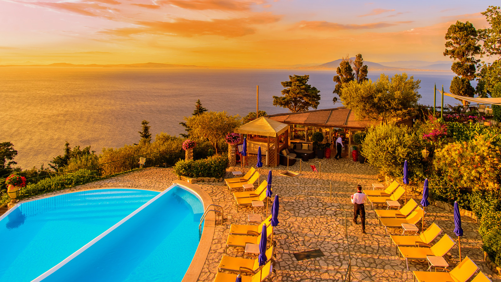 Hotel Ceasar Augustus ligger på klippkanten av Monte Solaro, 300 meter över havet med en utsikt över Neapelbukten och Amalfikusten man bara kan drömma om. Hotellet är familjedrivet och har en elegant och genuint varm och välkomnande atmosfär. Den imponerande villan var en gång i tiden den ryske prinsen Emanuel Bulhaks hem och det var han som placerade statyn av kejsare Augustus på terrassen. Sedan 1930-talet har familjen Signorini förädlat den eleganta inredningen med antikviteter man funnit på marknader i världens alla hörn. Rum och sviter ligger i två byggnader, där huvudvillan bjuder på spektakulära vyer i alla väderstreck, även från badrummen med stora fönster. Alla är unikt inredda med klassiska möbler och 1900-talsmåleri. Vill du uppleva något extra väljer du någon av de sex sviterna. Här finns en underbar infinitypool på nedre terrassen och det ligger ett litet fitnesscenter undangömt bland vingårdar och citronträd. Här kan du också njuta vissa behandlingar. Endast 15 minuterspromenad från Hotel Caesar Augustus ligger Anacapri med sina små caféer, restauranger och Axel Munthes fantastiska Villa San Michele. I den utmärkta restaurangen La Terazza di Lucullo serverar Chef Eduardo Vuolo fantastiska rätter, tillagade på lokala råvaror och oftast från den egna köksträdgården. Varje onsdag arrangeras en matlagningskurs och på fredagar kan du få följa med till den lokale fiskaren och välja din egen fångst till middagen.