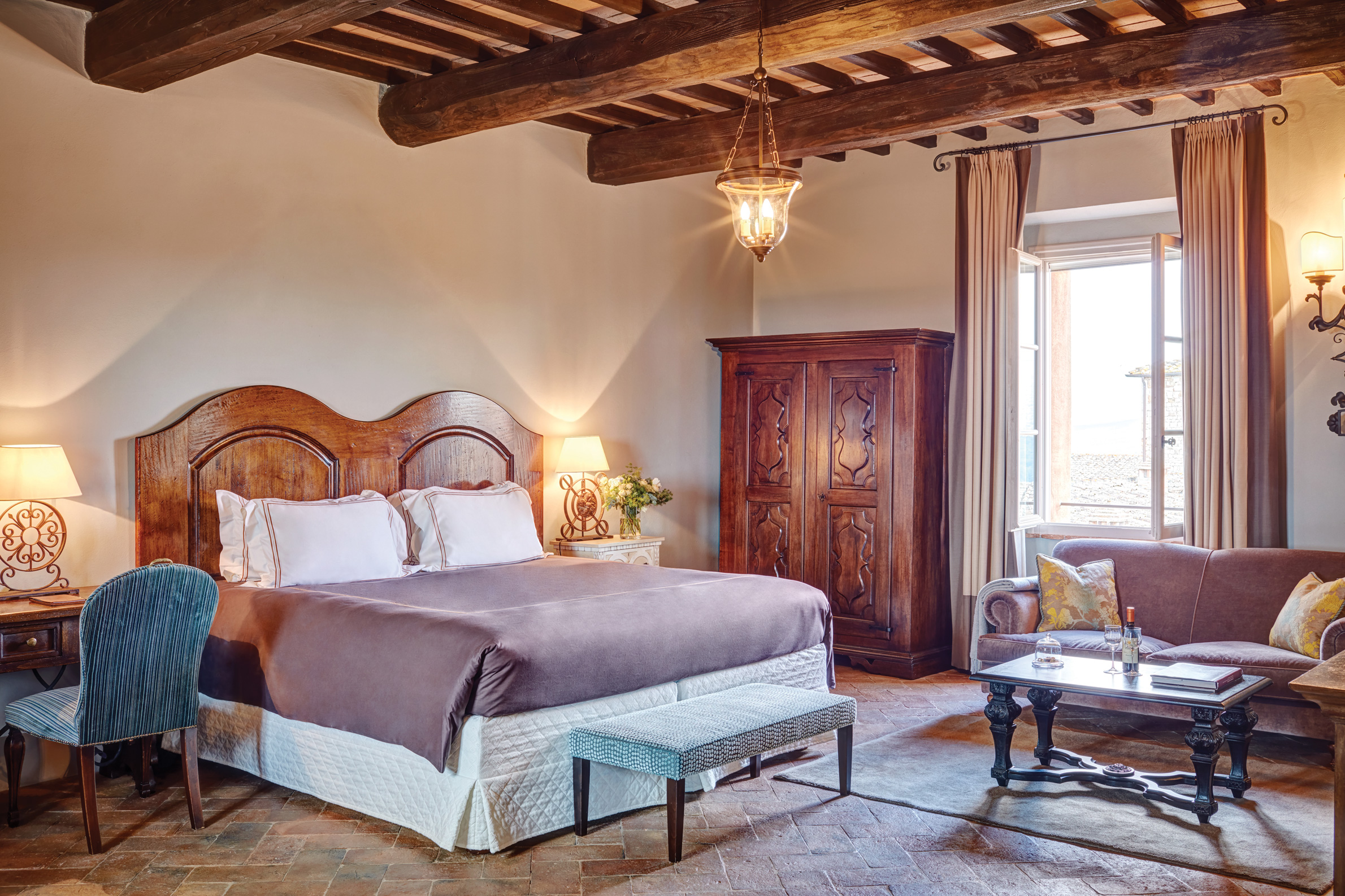 Toscana är inte bara känt för sitt goda vin, det vackra landskapet med sina böljande kullar och den gudomliga maten. Här finns också många gamla välbevarade slott. Castello di Casole byggdes på 900-talet och har under åren varit hem för kungligheter, filmstjärnor och politiker. Idag har byggnaderna omsorgsfullt restaurerats och kombinerar historia med nutid på ett smakfullt och elegant vis. Omgärdat av den toskanska landsbygdens mjuka kullar, vingårdar och fylliga cypressalléer är Castello di Casole en glimrande pärla och perfekt tillflyktsort för smekmånadspar eller för de som bara vill finnas till. Personalen står redo att skämma bort dig till det yttersta. Interiören är omsorgsfullt genomtänkt. Detaljer av återvunnet trä och terrakottaplattor skapar tillsammans en härlig italiensk lantlig och elegant mix. Rummen är dekorerade i neutrala jordnära toner och sängarna, med antika gavlar och erbjuder de bästa madrasserna du som gäst kan en kan tänka dig. Dessutom är de bäddade med sängkläder i fantastiskt linne. I de eleganta badrummen finner man fristående badkar, marmor- eller mosaikgolv och antika speglar. Hotellet har två restauranger som ofta får besök från de närliggande byarna och därigenom fungerar som en mötesplats där hotellets gäster kan föra spännande och givande samtal med lokalbefolkningen.Förutom att avnjuta något härligt vin från den gedigna vinlistan tillagas t ex också vällagade italienska pizzor samt underbara tallrikar med antipasti.