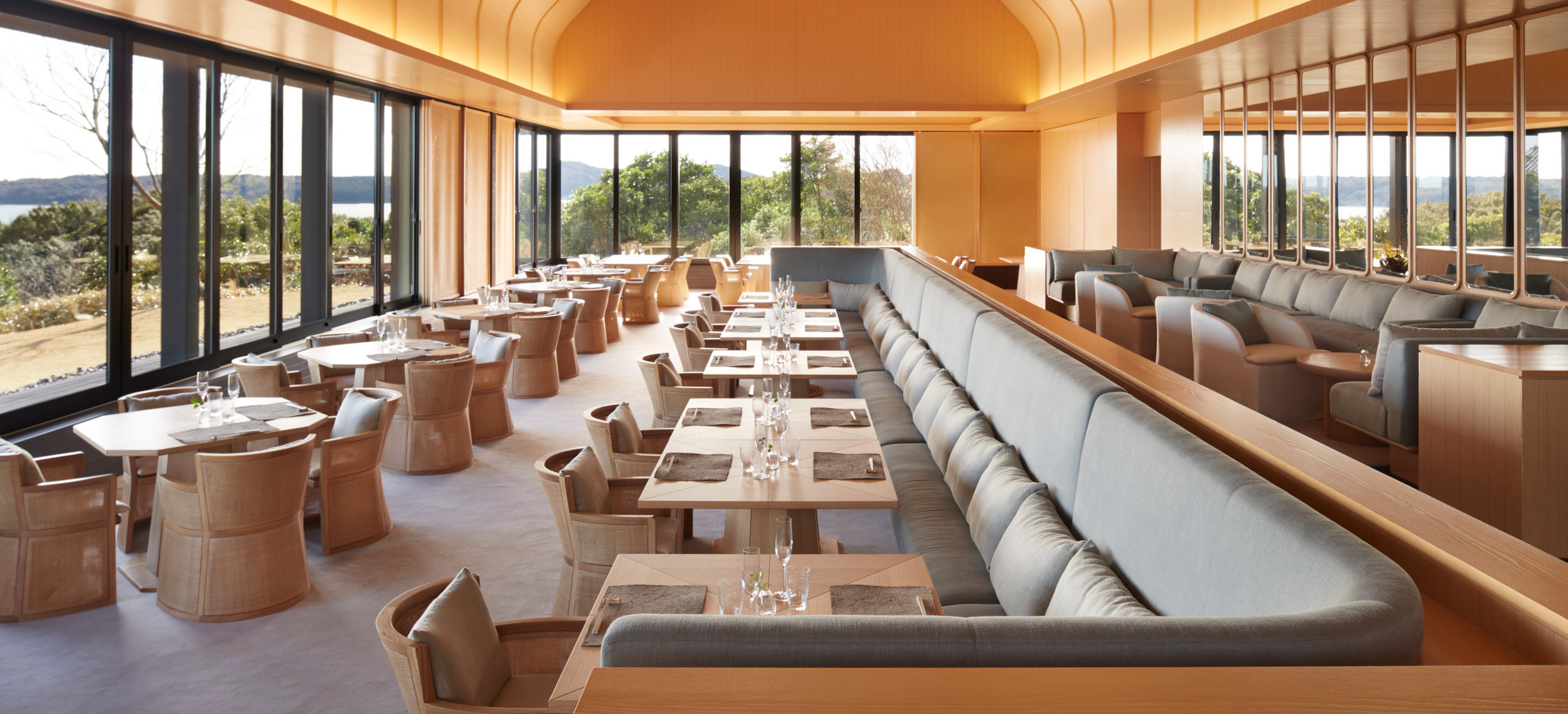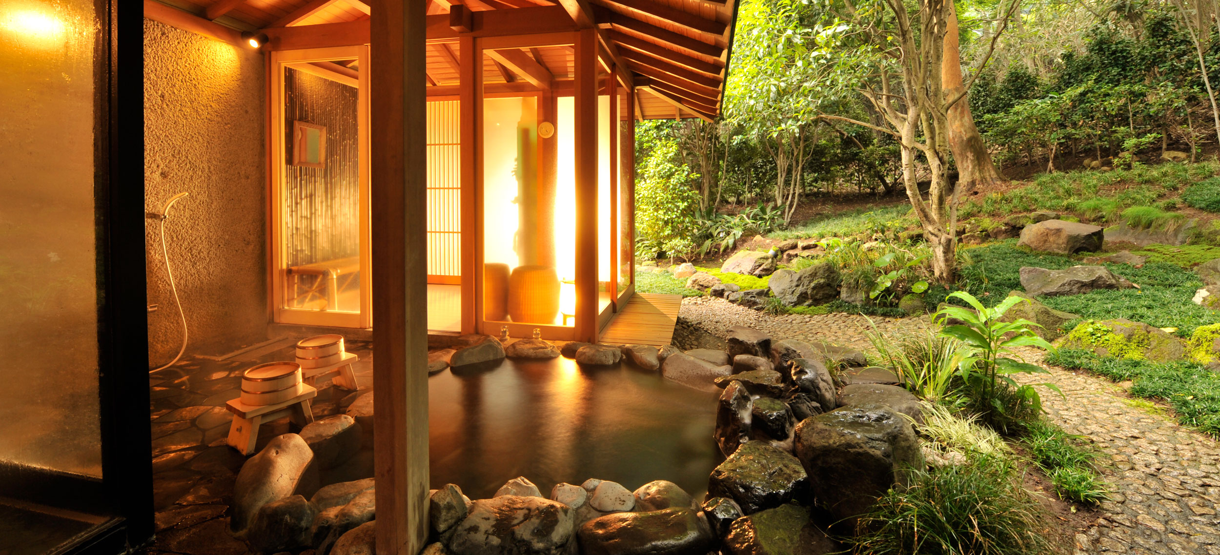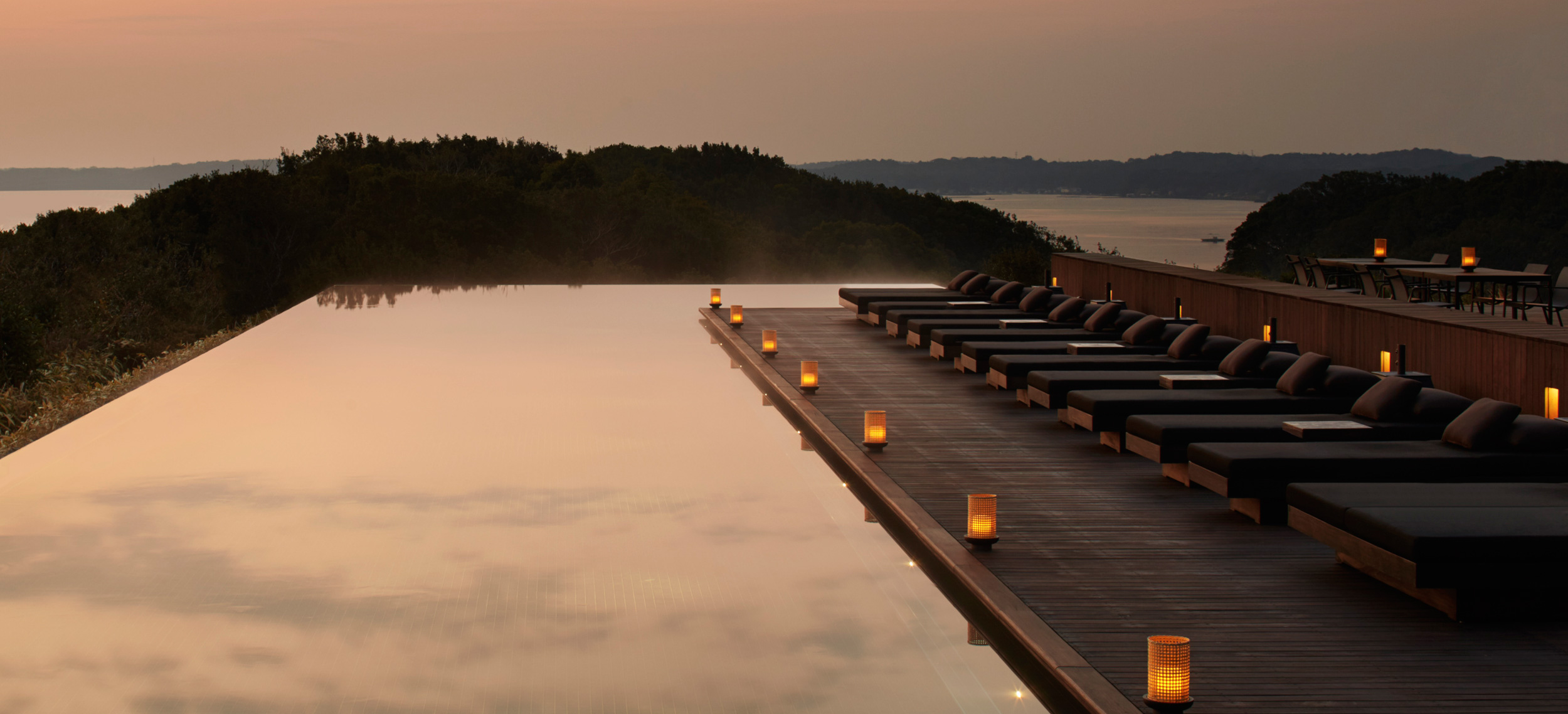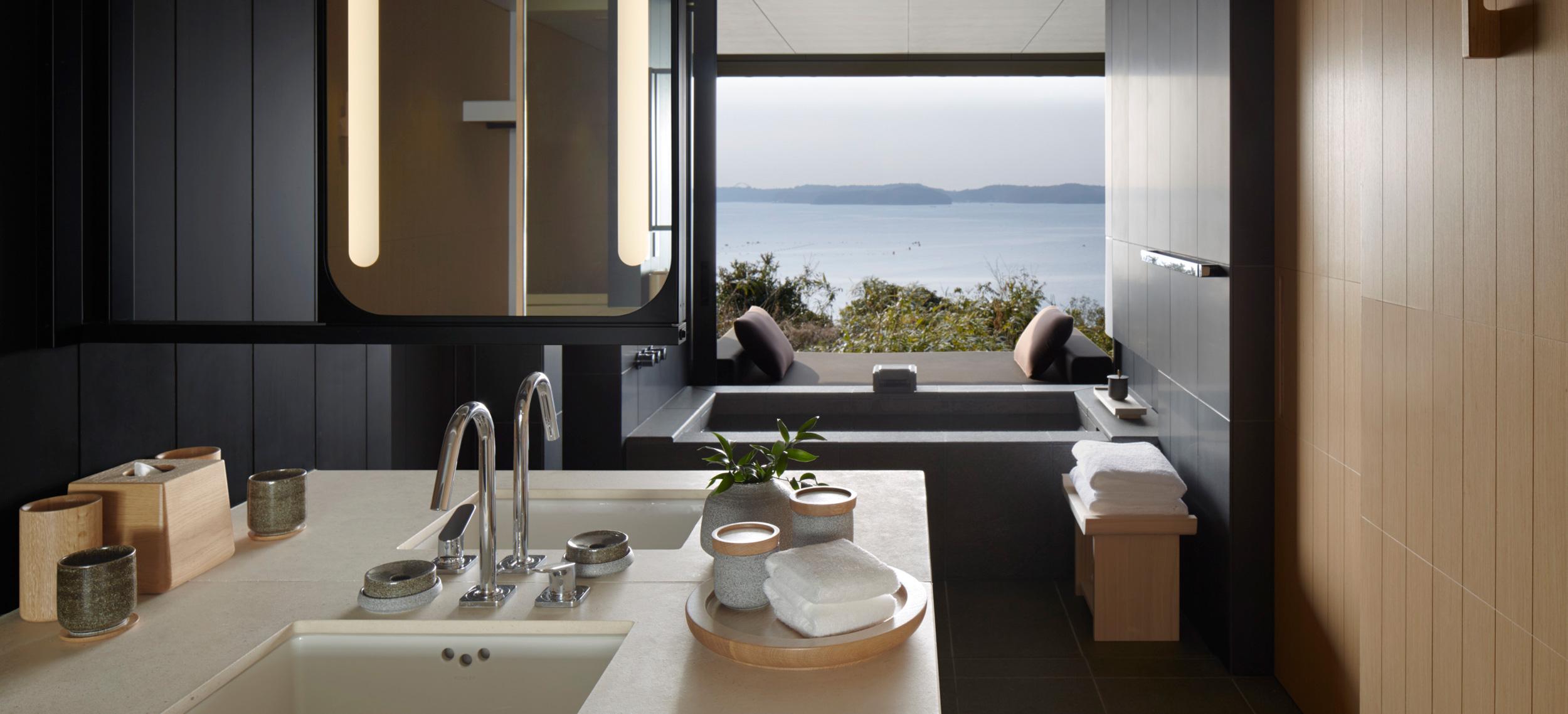 Utomhus finns en infinitypool med utsikt över bukten och två nedsänkta terrasser med eldar, som gjorda för stjärnskådning och cocktails. Spaet är fridfullt med allehanda bad, luftig yogastudio och watsu vattenterapi. Behandlingarna är rotade i traditionella japanska tekniker som scrub av wasabi och krossade pärlor, medan massagen utförs med oljor av cederträ och mandarin. Köket huseras av 12 kockar i ledning av Masanobu Inaba och är lika rik på smak som inredningen är minimal. Menyn är säsongsbetonad med allt från Mastusaka Waguy-biff till curry på hummer och klassisk sashimi. Baren och loungen med sina låga bord ock bekväma sittplatser är perfekt för att runda av med japanskt hantverksöl eller en Mebuki, en cocktail på grönt te, vodka, champagne och lime.