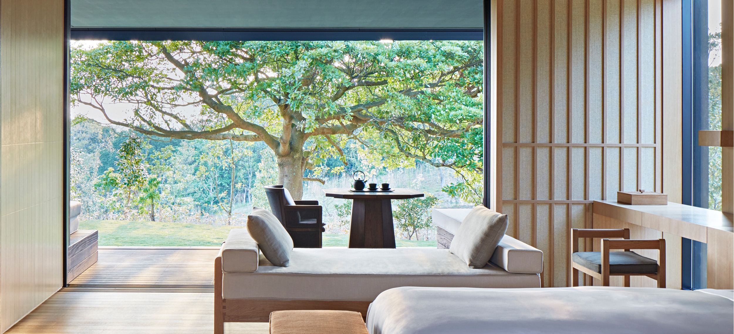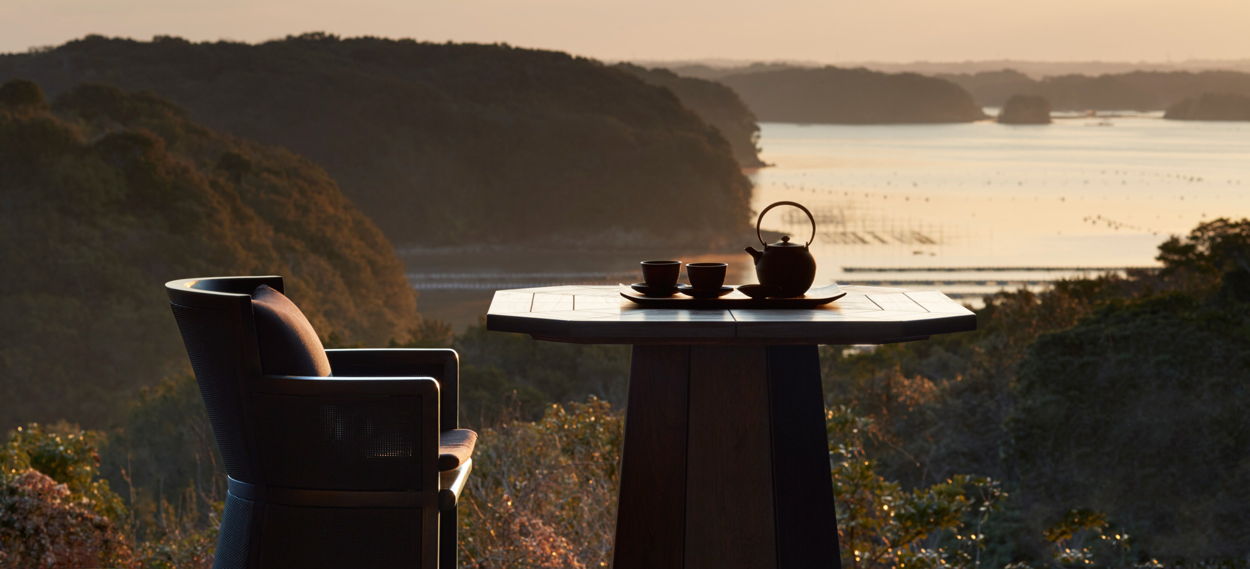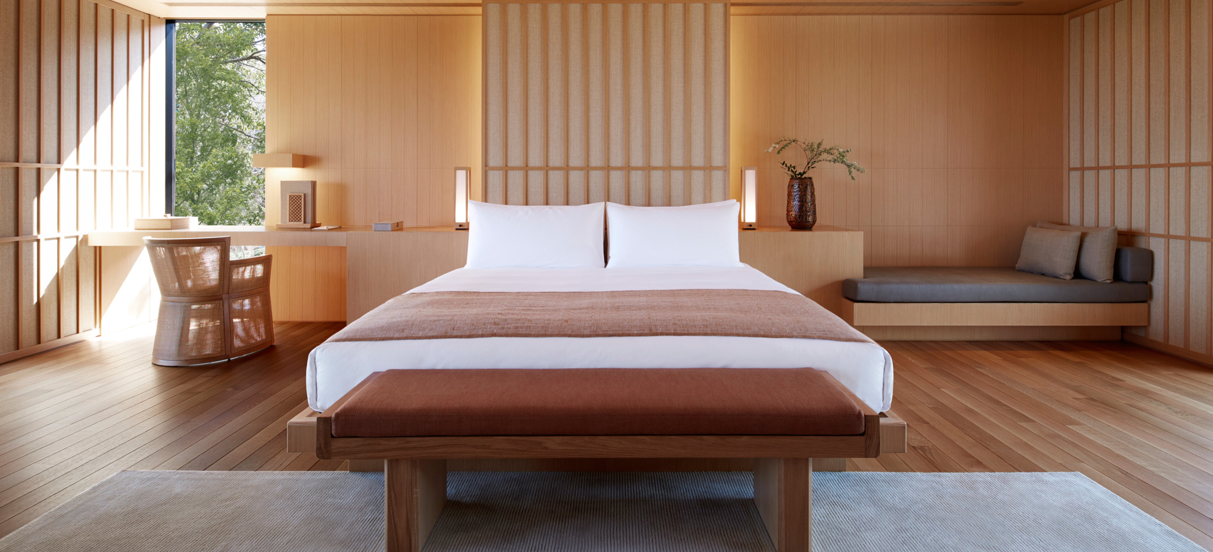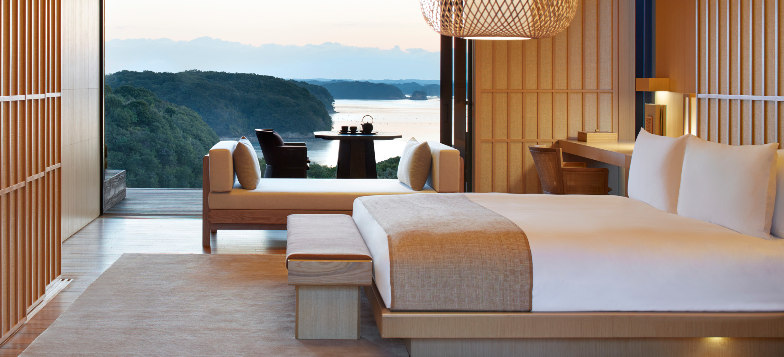 Den berömda hotellkedjan Aman har öppnat sitt andra hotell i Japan efter Tokyo, Amanemu i Ise. Isehalvön ligger inte långt från Nagoya och Kyoto och kusten är känd för sina kvinnliga pärldykare som utan tuber och annan utrustning dyker efter musslor och andra skaldjur. Kuststräckan är även känd för Meoto Iwa, Mikoto Pearl Island, templet Ise-Jingu och Ago Bay. Amanemus villor ligger på en kulle omgiven av skogsklädda kullor, golfbanor, heta källor och med härlig havsutsikt. Arkiteten Kerry Hill har skapat ett tempel till minimalism med ett modernt tag av traditionell japansk minka-hem. Här regerar naturmaterial som trä, bambu och sten bland villor i paviljongstil med lågt hängande kakeltak, glidskärmar och handsnidat trä. Boendet är rymligt och modernt med väggar av japansk hinoki-cypress, höga tak och välvda skärmar som döljer den modernaste teknik. Rummen har stora bambulyktor och väggar av glas som öppnar upp mot trädäck med dagbäddar. Badrummen har djupa, fyrkantiga kar i mörk basalt med tre kranar, en för varmt, en för kallt och en för onsen.