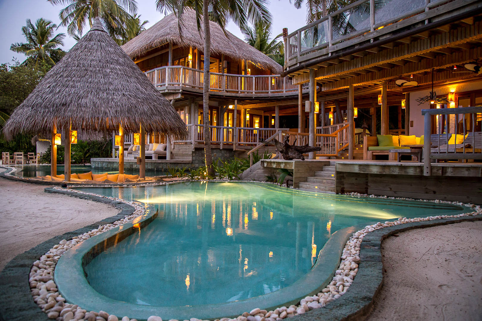 Ekolyxresorten Soneva Fushi ligger vid mantornas eget favoritrev på ön Kunfunadhoo och har genom åren blivit ett begrepp när det gäller intelligent och miljömedveten lyx. All inredning är miljövänlig och designen kan enklast beskrivas som "häftig Flintstone-lyx”. Villorna, från ett till nio sovrum, ligger mjukt inbäddade i öns grönska, direkt intill en egen remsa av den vita stranden – och kommer med en egen cykel. På Soneva Fushi ligger fokus på lyx i form av ovanliga upplevelser. Som att bli strandad med picknick på en öde ö, betrakta stjärnhimlen genom Indiska oceanens största teleskop, snorkla med mantor guidad av hotellets egen marinbiolog, njuta av elegant gourmet gjord på organiska råvaror med fötterna i sanden eller högt över trädtopparna efter efter en hisnande tur med zipline. Ön gästas även av världens bästa kockar som står värd för chef's table i paradiset. Hotellet har ett samarbete med svenska tennisproffset Jonas Björkman, så bli inte förvånad om du träffar honom på plats. Bli heller inte förvånad om dina barn aldrig vill semestra någon annanstans efter vistelsen här – Soneva Fushi stoltserar nämligen med en av Maldivernas bästa barnklubbar.