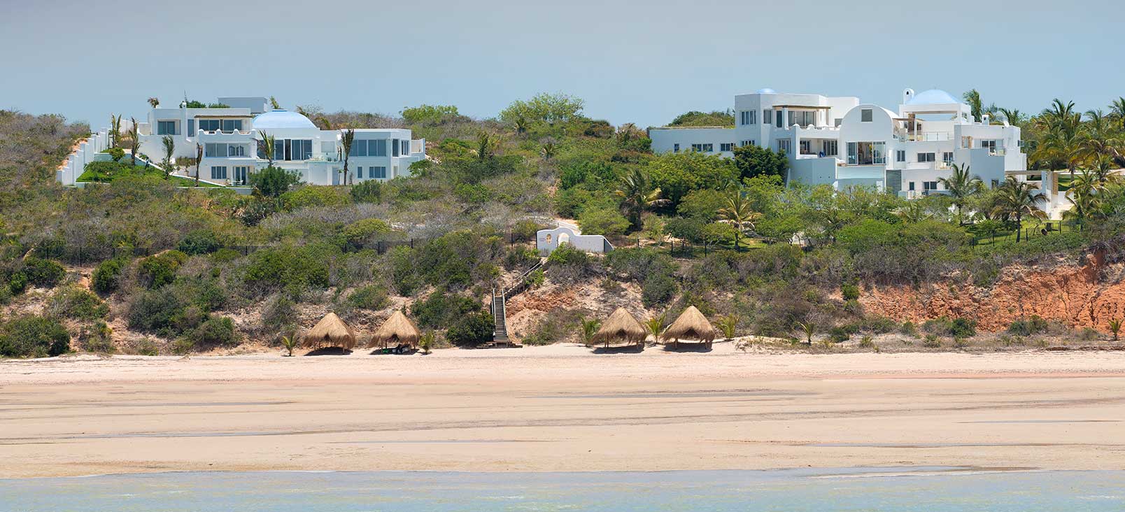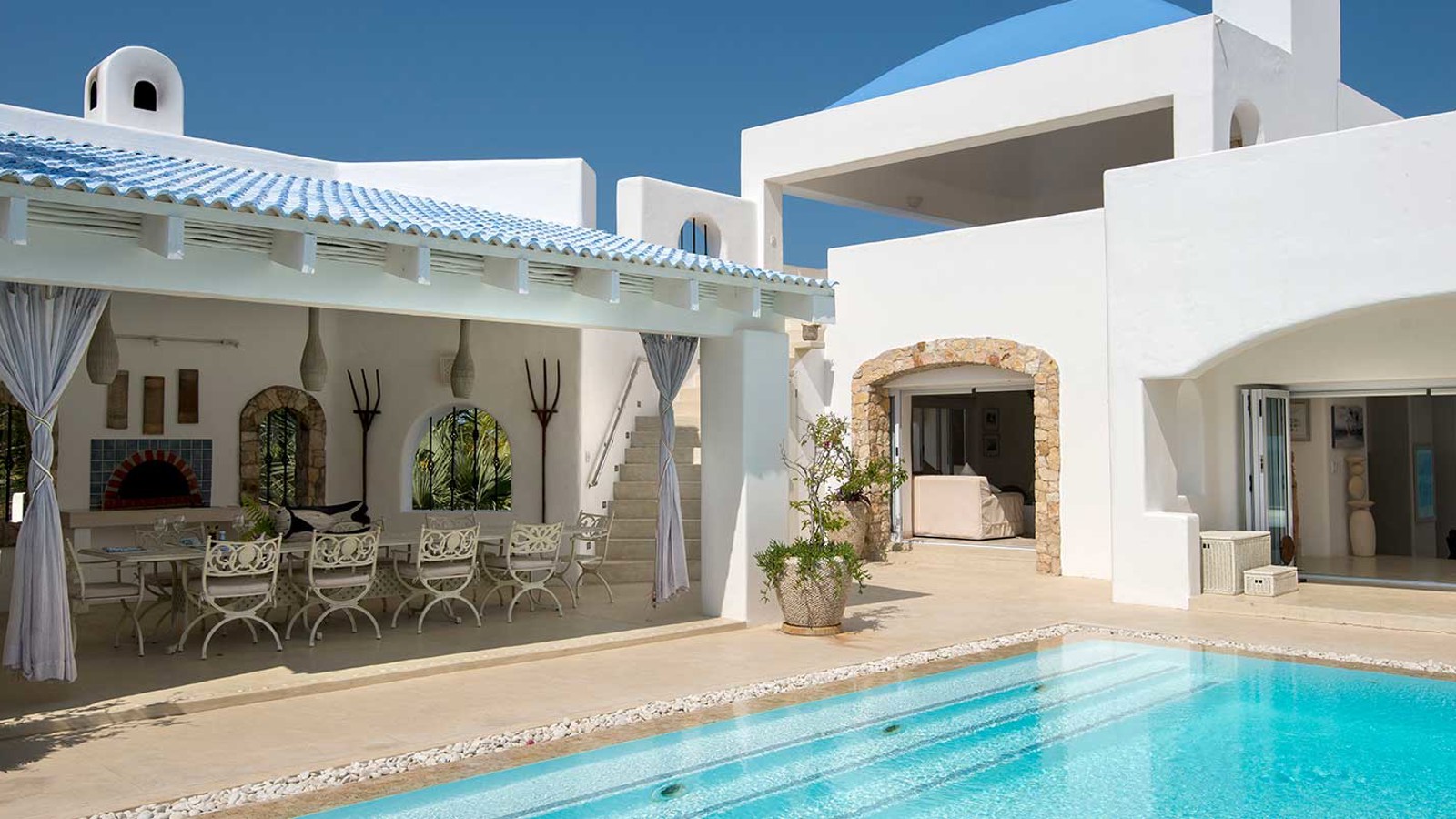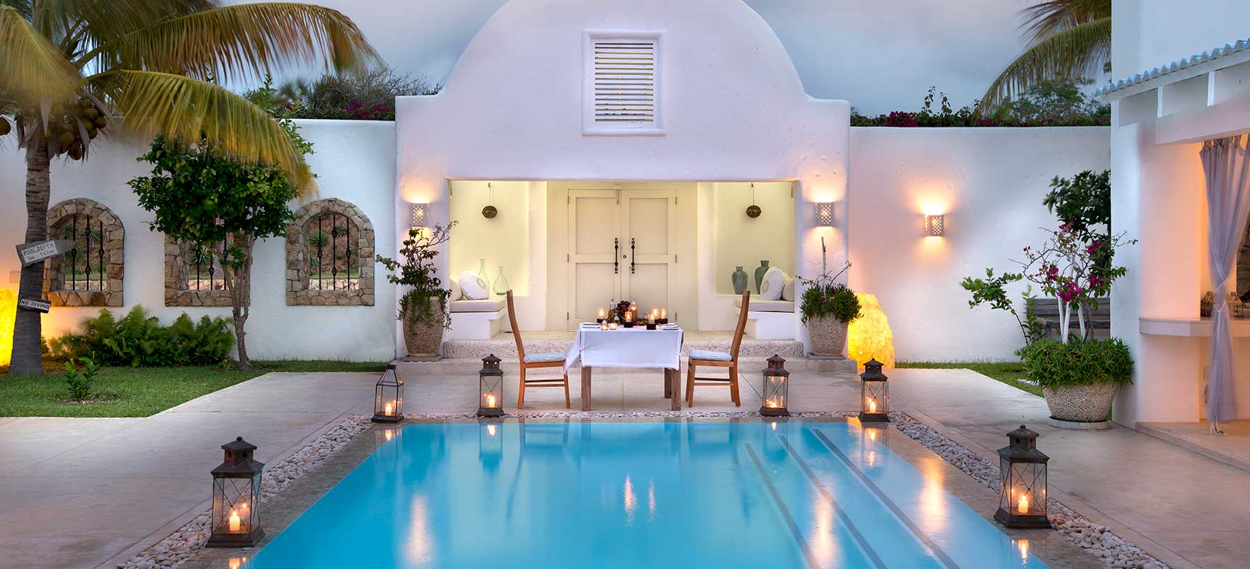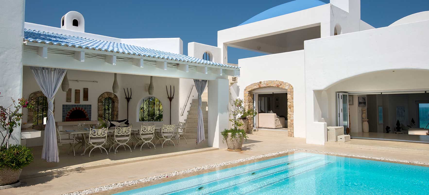 Vitmurade Santorini med sitt Kyklad-blå tak är ett landmärke norr om kuststaden Vilanculos – staden som är porten ut mot arkipelagen Bazarutos stränder av vaniljsocker ett hav blått som topas. Läget för villan som drivs som ett boutiquehotell är det allra bästa. Högt och privat samt frontar mot en egen sandstrand, skyddad i en stor marin nationalpark. Santoroni består av en stor villa med fem sviter och ett fristående privat gömställe för smekmånadsfirare, The Chapel, och ytterligare en 3-sovrumsvilla. Alla sviter vetter mot havet och har stora privata balkonger. Här finns en stor pool, avskilda terrasser, bar och en intim matsal. Den vindskyddade innergården är en oas. Från Santorini går en trappa ned till stranden. Köket bjuder på dagliga menyer tillredda av färska råvaror och köket är öppet 24 timmar om hungern skulle smyga sig på i den afrikanska natten. Spabehandlingar kan ordnas på begäran. Som boende på Santorini har du gratis transfer till Vilanculos och en guidad tur på stadens matmarknader. Dessutom aktiviteter som kajakpaddling, paddleboards och sandboard. Hotellet har dessutom en privat båt som kan bokas för djuphavsfiske.