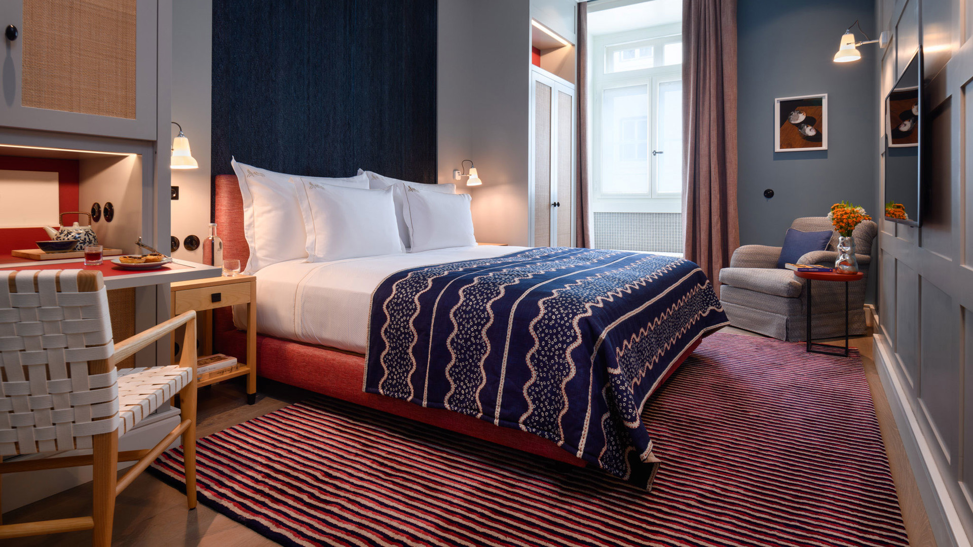 Bairro Alto Hotel ligger precis i utkanten av den sjudande stadsdelen med sitt livliga nattliv, restauranger, barer, labyrint av kullerstensgator och trendiga hotell. Läget är ”lugnt”, en bit från de livligaste barerna och väljer man ett rum i söderläge blir nattsömnen garanterat ostörd. Bakom den kanariegula fasaden i stor och gammal stil tar en djärvare design vid, hela tiden med en modern twist och toner i guld och svart. Rum och sviter är inredda med tanken att en bit av staden skall tas med in i rummet. Färgpaletten är det vita från trottoarer och gator, det gula från spårvagnarna, takpannornas terrakotta och floden Tejos blåa ton. De stiliga badrummen går i marmor och mörkt trä med duschhuvuden stora som tallrikar samt utrustade med produkter från Molton Brown. Hotellpersonalen är ung, stilig och hjälpsam, alla trendigt klädda i helsvarta kostymer samt guldfärgade sneakers. Bairro Alto Hotel har en underbar takterrass som gjord för iskall vinho verde i glas med sommarnattskondens. På 5:e våningen ligger även hotellrestaurangen BAHR som serverar portugisiska och sydeuropeiska specialiteter som t ex rostad marulk och kalv. Avsmakningsmenyn från havet är populär om man gillar cevice, brässerade sardiner och en bouillon på fisk.