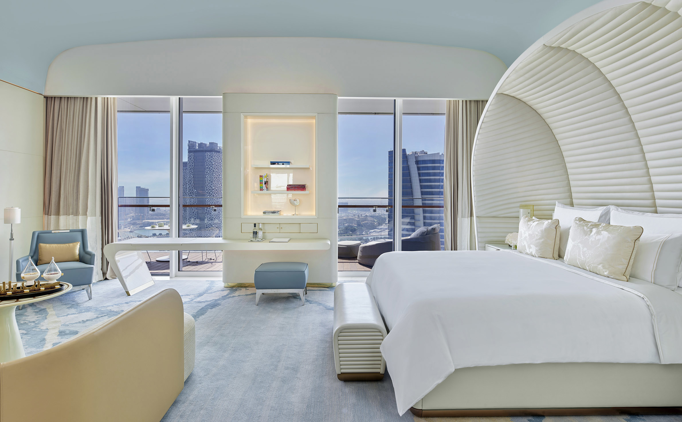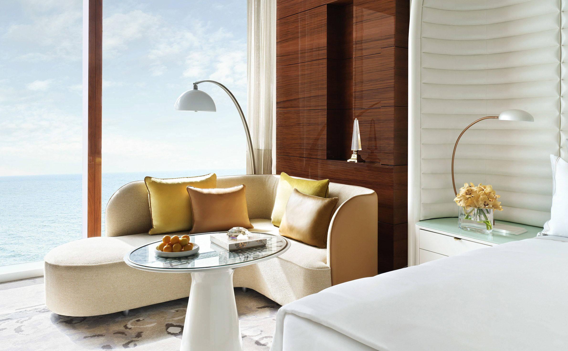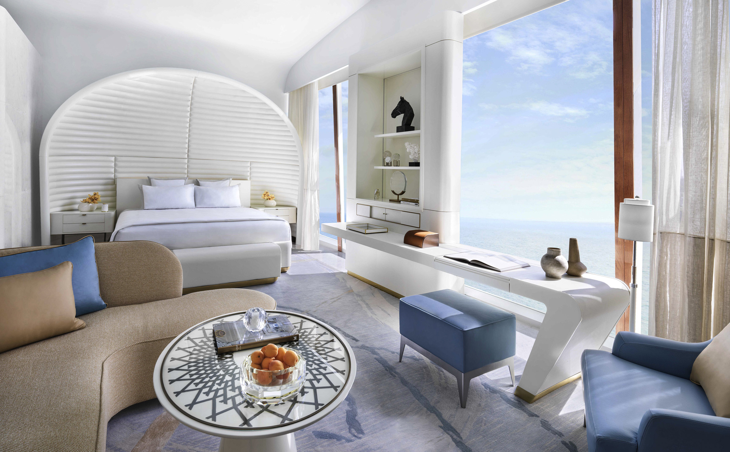 Fairmont Doha är ett av två ultraexklusiva hotell som huserar i Katara Towers, Qatars imponerande skyskrapa som sträcker sig 211 meter upp i luften och efterliknar de två böjda svärden i landets emblem. Hotellets 362 rum är inredda med inspiration från lyxyachter. Inget har lämnats åt slumpen bland mosaikplattor med 18-karats bladguld, vita lädertyger och kurviga kanter. I receptionen möts gästerna av världens största kristallkrona, 56,5 meter hög. Precis som på Raffles Doha, ger personalen intrycket av att verkligen trivas med sitt jobb och på något förbluffande sätt tycks de alltid veta vad du behöver innan du själv gör det. Fairmont Dohas 4000 kvadratmeter stora spa erbjuder allt du kan förvänta dig inom wellness, skönhet och fitness plus några oväntade faciliteter, som en klättervägg och nio behandlingsrum där du kan svänga förbi för att få ett vitamindropp. När magen kurrar väntar fem olika matställen. Från förtjusande parisiska bakverk på Dôme till empanadas och ceviche på Vaya och teppanyaki på Provok. Juvelen i kronan är den indiska restaurangen Masala Librarys experimentella avsmakningsmeny. Värt att veta är att Fairmont Doha inte har någon sandstrand, men vad gör det när du som gäst i stället har tillgång till en exklusiv flytande ö mitt i Persiska viken? Härifrån kan du njuta av svalkande dopp, goda måltider och drinkar medan du beundrar Dohas spektakulära solnedgång.