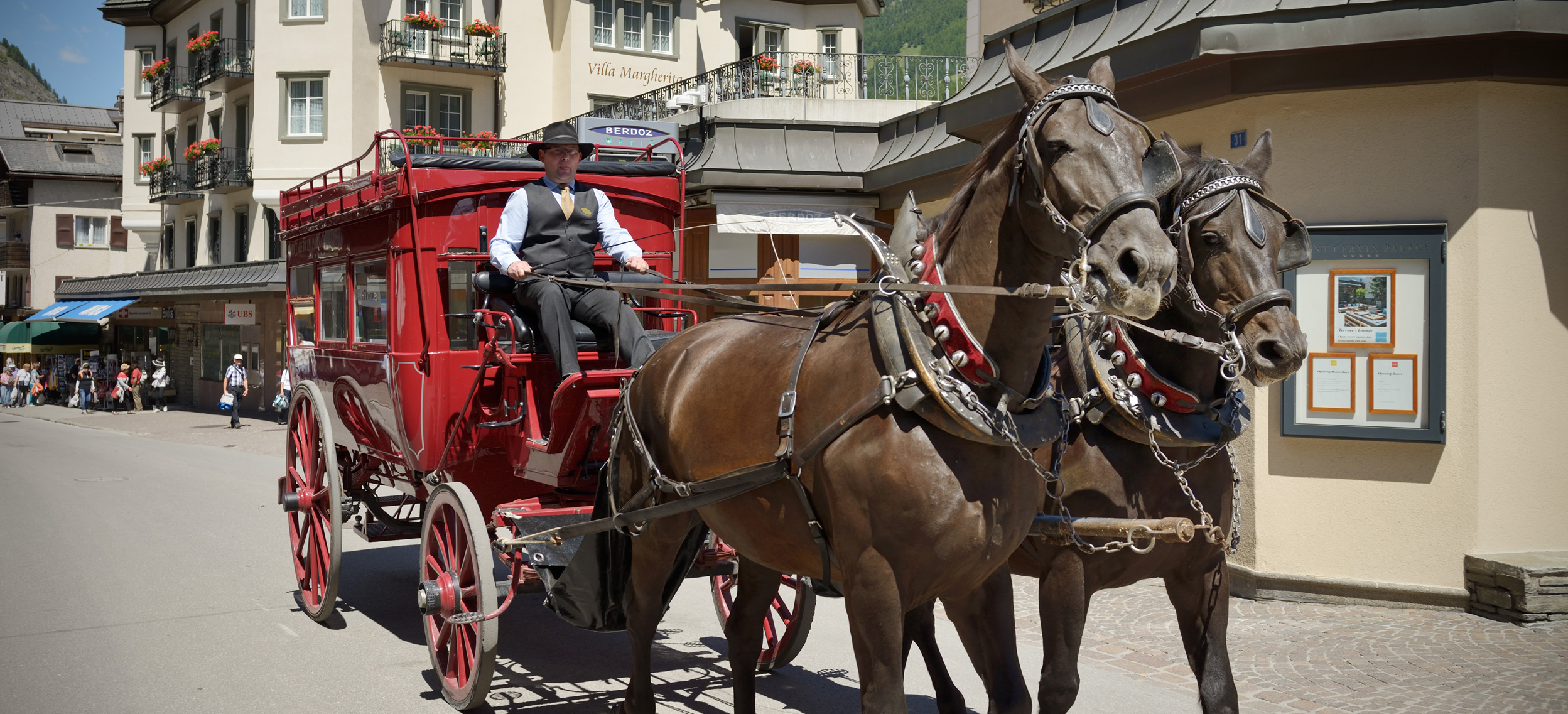 Med bästa läge mitt i hjärtat av Zermatt har Mont Cervin Palace välkomnat sina gäster ända sedan 1851. Det röda ekipaget med häst är det populäraste motivet på bild och det är just denna vagn som väntar på stationen när tåget kommer in. Hotellet erbjuder eleganta rum och sviter i fyra olika byggnader - alla är sammanlänkade med varandra. Efter en dag i skidområdet är det härligt att få tillbringa lite tid i hotellets stora Spa eller i inomhuspoolen. Totalt finns 13 olika restauranger i byn och belägna på de 3 hotell som finns inom samma ägarfamilj. Mont Cervin Palace är ett av Zermatts bästa hotell!