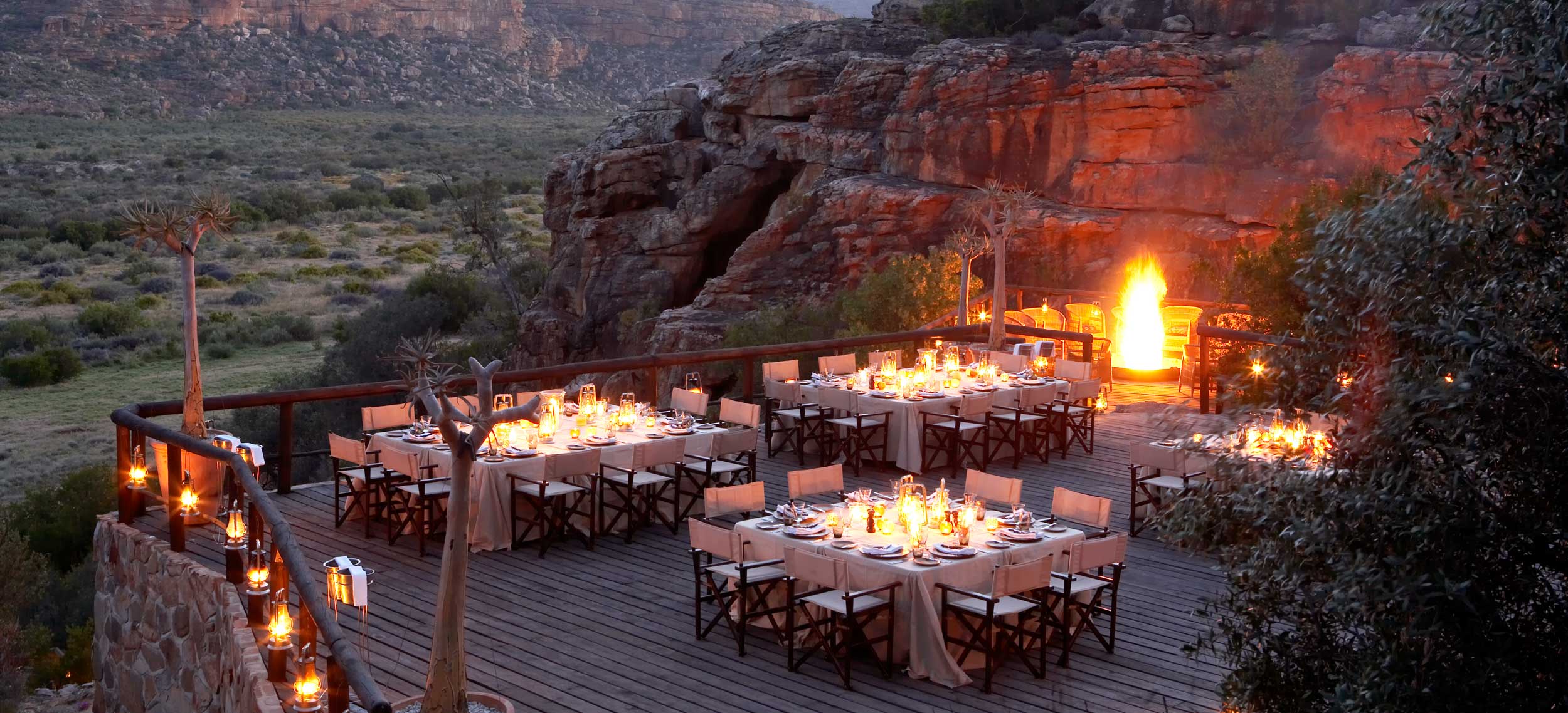 Det branta sydafrikanska bergsmassivet Cederberg är ett geologiskt paradis. Bergväggarna varvas med djupa raviner som präglats av vind och regn där fossila rester av utdöda arter från den gamla havsbottnen samsas med granitblock och betande antiloper av allehanda utseenden och former. Mitt i denna robusta skönhet ligger det Bushmans Kloof, en intim lodge mitt i ett privat reservat. Lodgens 16 rum och sviter omges av frodiga gräsmattor och välskötta trädgårdar som du når direkt från vardagsrum eller matsal. Varje boende har en privat terrass eller uteplats och den eklektiska inredningen är en blandning av sydafrikansk- och kolonial stil med vacker konst. Tre kilometer från huvudbyggnaden ligger avsides Koro Lodge, en restaurerad liten bondgård med egen personal för de gäster som söker avskildhet. Miljötänket är medvetet och inriktat på hållbarhet och ägarfamiljen strävar efter att gradvis återinföra områdets inhemska flora och fauna, inklusive den utrotningshotade Cape Mountain-zebran. Området är ett kulturarv med 10 000 år gamla stenskulpturer och väggmålningar av det antika urfolket San-folket. Ströva på egen hand i ett rovdjursfritt reservat, eller paddla i sandstensjordens orörda vattendrag. Höjdpunkten för ett besök är under den vilda vårblomningen. Njut gärna det välsmakande köket med en romantisk middag uppdukad i vildmarken, upplyst av en brinnande lägereld, stjärnorna och hundratals blinkande lyktor och ljus.