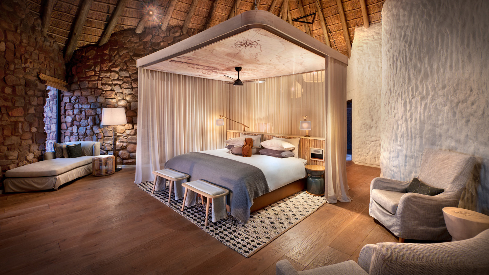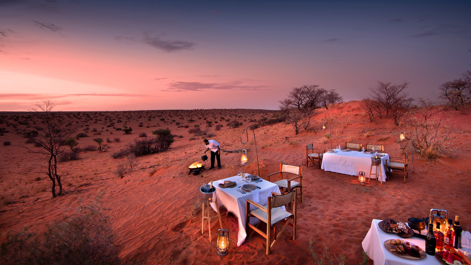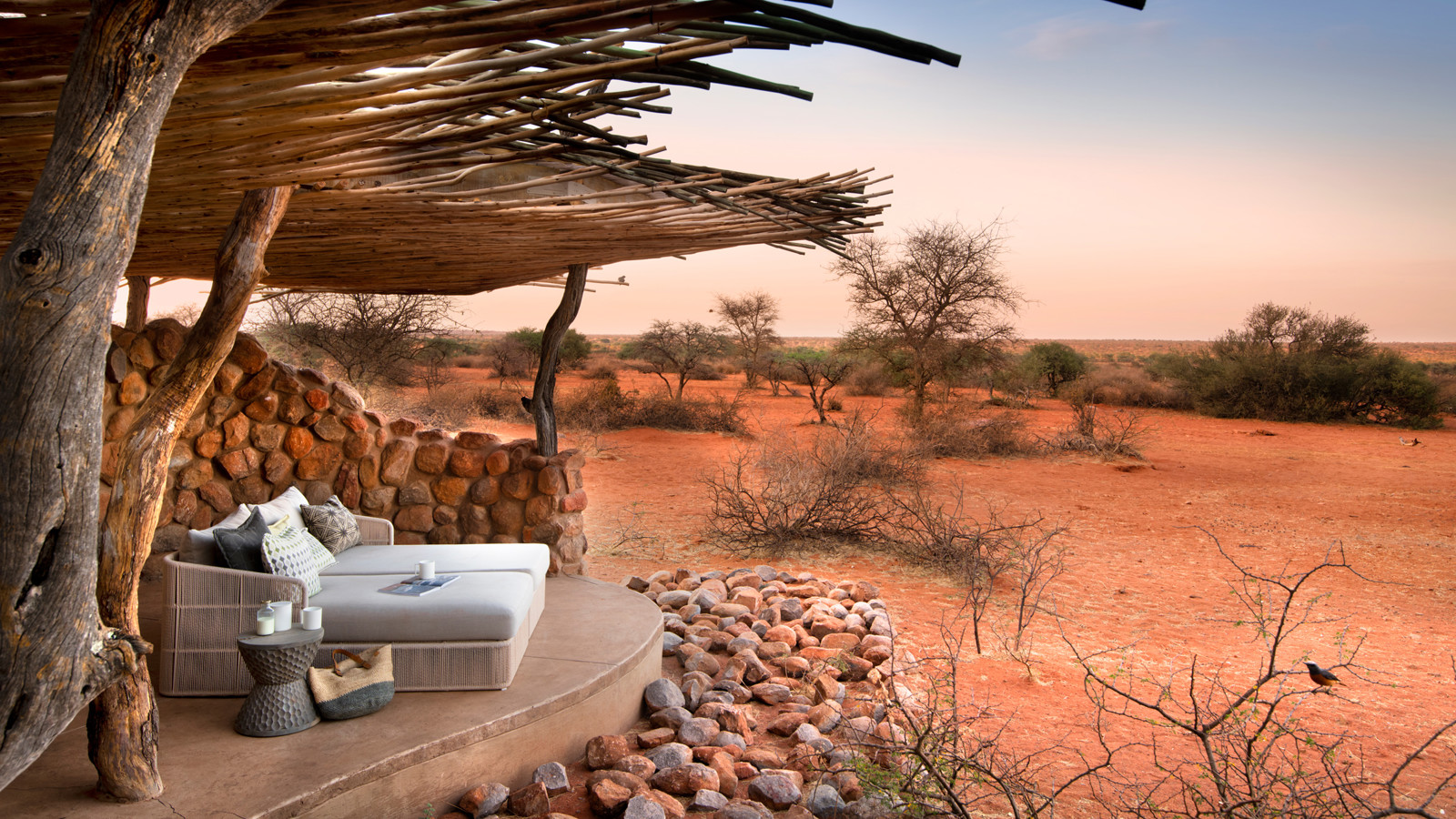 Det är detaljerna och den diskreta lyxen där inget lämnats åt slumpen som gör familjen Oppenheimers camp i det stora privatägda reservatet Tswalu Kalahari helt unikt. Campen består av tre delar; The Motse Camp, Loapi Tented Camp och Tarkuni Homestad. I Motse Camp står åtta stora, privata sviter av sten, röd lera byggt under traditionella halmtak. Här har den världsberömda inredaren Boyd Ferguson blandat afrikanska artefakter, konst och barfotalyx i en Safari Chic-blandning som fått internationella resemagasinet Condé Nast Traveller att sprida superlativ. Sviterna består av rymliga sovrum med öppen spis, privat terrass och fantastiskt badrum både inom- och utomhus. Motses vackra pool har en fantastisk utsikt över savannen och vattenhålet som kallats Afrikas eget Cipriani. Tarkuni Homestead är ägarfamiljens privata hem. Här finns en egen kock och privat safariguide för den totalt skräddarsydda upplevelsen. Fem makalösa sviter med magnifika badrum och pool gör upplevelsen privat, unik och perfekt för familj, goda vänner eller högtidsfirande. Dessutom har Tswalu ett eget sovdäck mitt ute i vildmarken för den ultimata upplevelsen av safari och av Afrika.