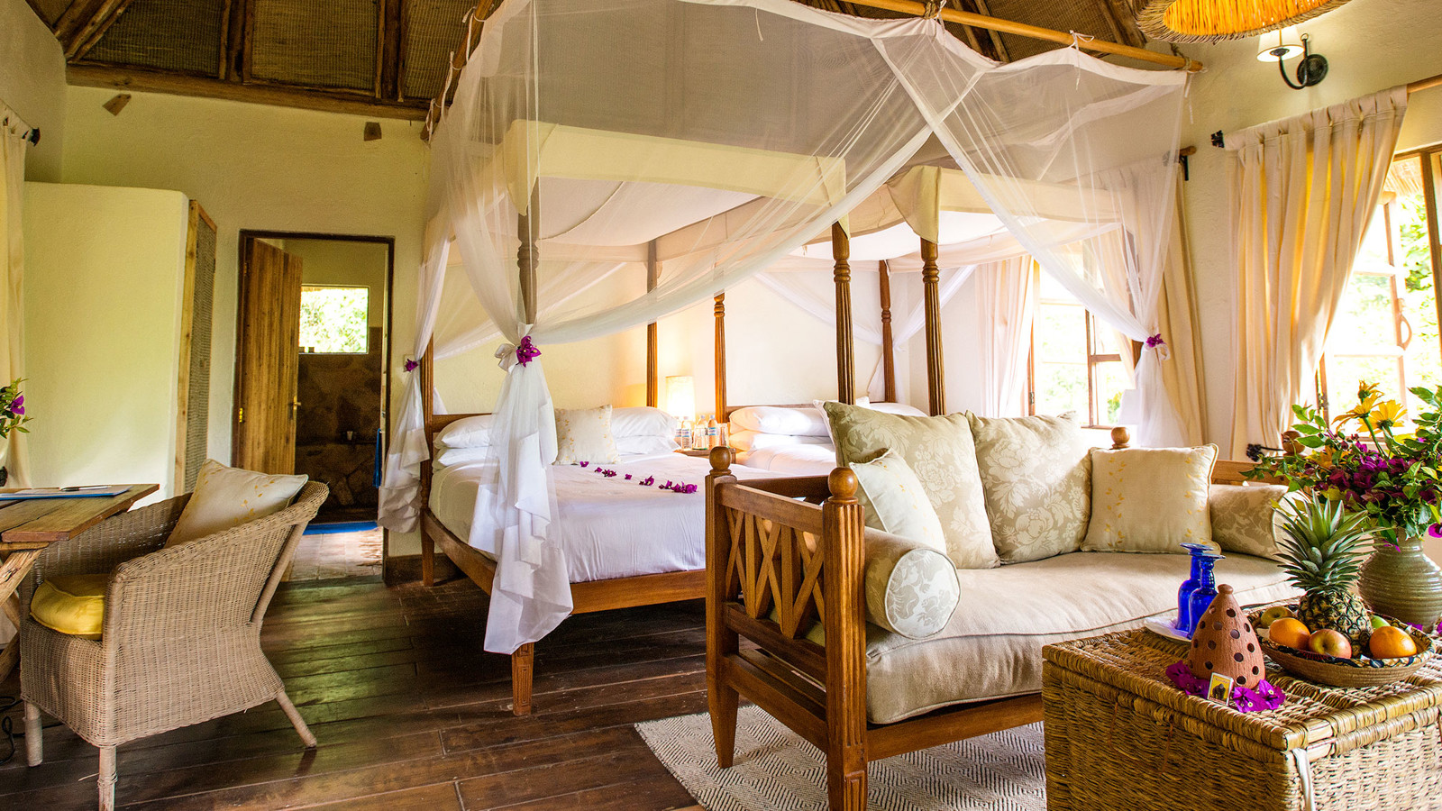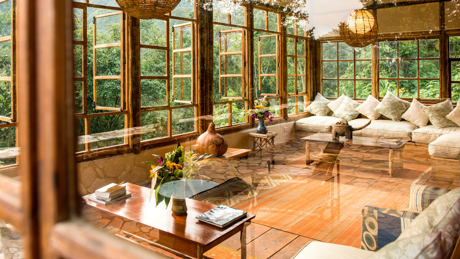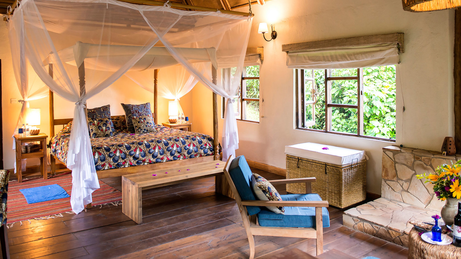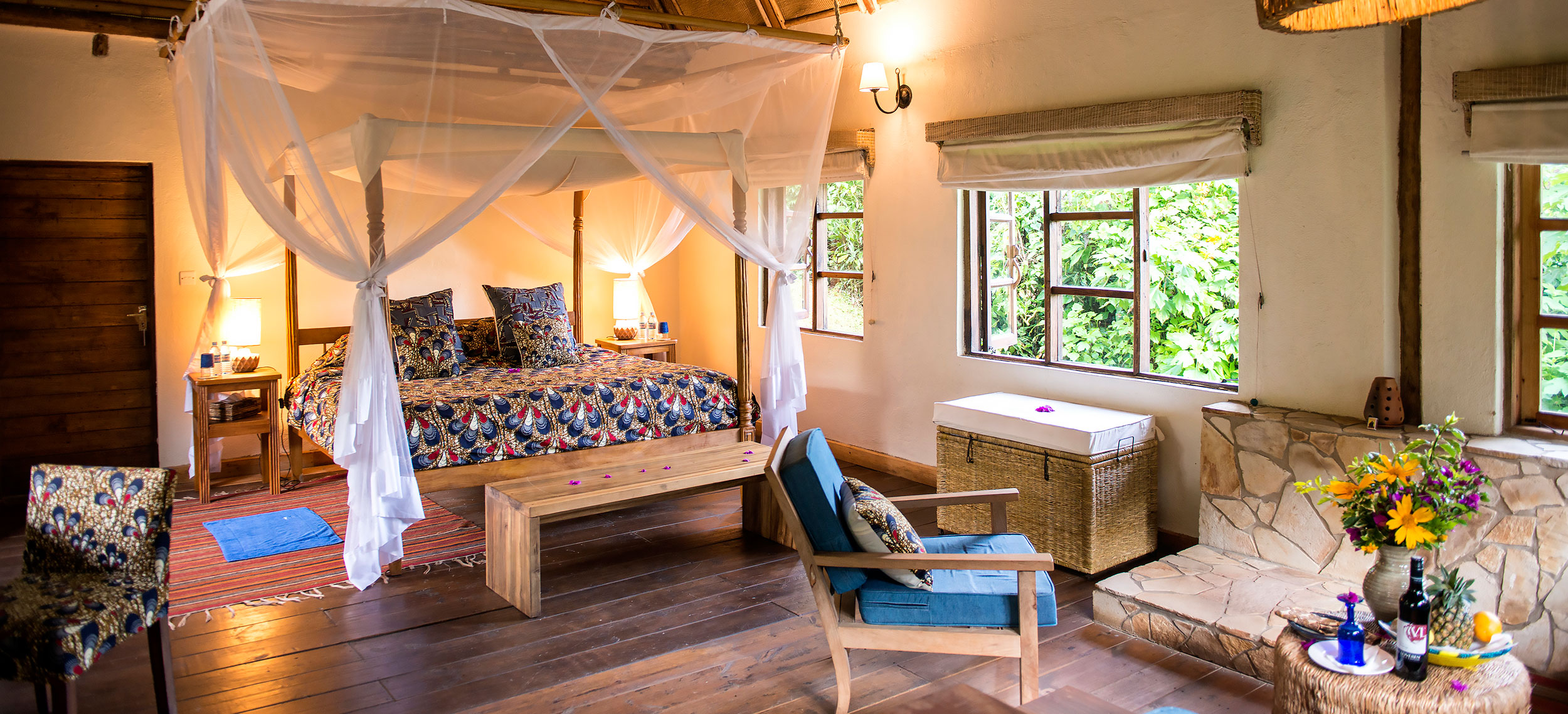 När Bwindi Lodge öppnade sin bas för gorillaspårning utanför byn Buhoma för 20 år sedan var det en av landets allra första. Campen har sedan dess utvecklats till en vacker lyxlodge med exceptionell service i en spektakulär miljö. Till och med gorillorna lockar sig själva till ett eller annat besök. Trots lyxen har Bwindi behållit sin rustika charm med allt från design till att du faktiskt kan ta en enkel stig ned till en svalkande ström i skogskanten och ta en simtur -med apor som enda åskådare. Design och inredning går i timmer med halmtak och stora sittbrunnar i sten omgivna av soffor och korgstolar, lika bekväma som perfekta för en Gin Tonic under någon av dygnets alla timmar. Boendet sker i åtta individuellt inredda ”boutique-bandas” döpta efter olika gorillor. Du sover i handsnidade himmelssängar bäddade med stärkta vita sängkläder, och på terrassen, med utsikt över Bwindis sagolika berg, står härliga dagbäddar med stora kuddar. Golven går i mörka träslag och taken i raffia. Badrummen är i sten med roligt färgglada handdukar. Här finns en personlig butlerservice där en påläst teammedlem tar hand om dig under hela vistelsen. Du får hjälp med att brygga kaffe om morgonen, hålla eldstaden vid liv och om kvällen bränna eteriska oljor i rummet för en vilsam sömn. Köket serverar fantasifulla och läckra rätter med lokal krydda, där grillkvällarna på terrassen är en given favorit.