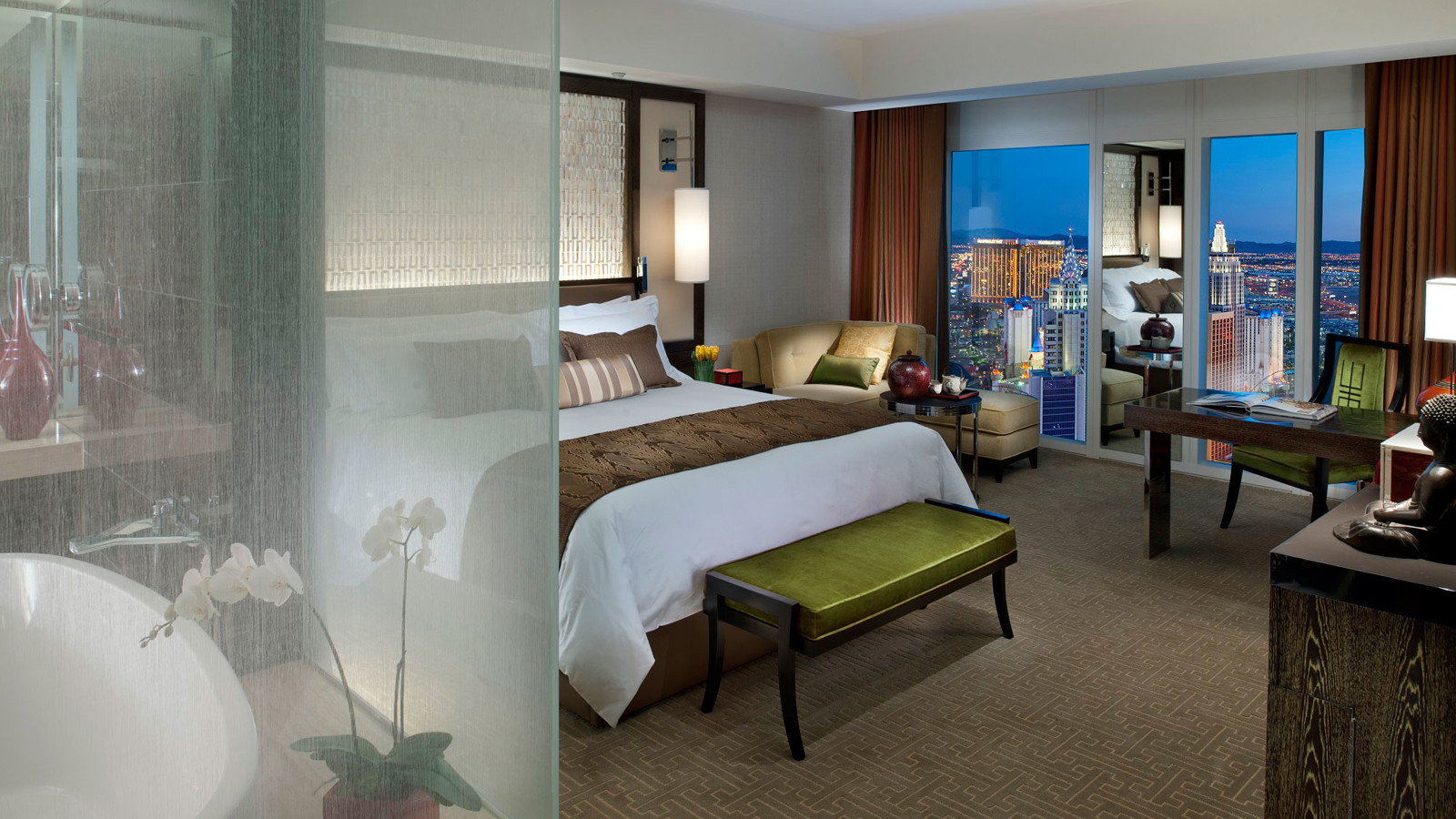 Waldorf Astoria i Las Vegas är ett förbluffande vackert och väldesignat hotell i en stad som annars inte är som mest känd för smak eller stil. Hotellet har ett perfekt läge på vid The Strip precis vid Aria, och har en egen skybridge till shopping- och nöjescentret Crystals. Även om Las Vegas är glitter, shower och casinoslammer hittar man lugnet på Waldorf Astoria som saknar casino men istället satsat på komfort och lyx. Den vackra inredningen och designen är modern och elegant med vacker belysning och subtila asiatiskt inspirerade inslag. De vackra rummen översvämmas av ljus, har en lugn och neutral färgpalett mot mörka möbler och vackra sänggavlar i trä eller exotisk pärlemor. Hotellets sviter är inget annat än magnifika med utsökt stil och klass. Mörka träslag, silver och fönster från golv till tak. Las Vegas har några av USAs bästa restauranger. En av dem är Twist by Pierre Gagnaire som erhållit den åtråvärda Forbes Five Star 2014. Pierre Gagnaire har många Michelinstjärnor på sitt samvete, nu senast hans trestjärniga självbetitlade restaurang i Paris. Det franska köket med modern twist serveras i en underbar matsal under 300 jordglober i guld och ett upphängt vinloft. Waldorf Astorias spa är en fridfull oas fördelad på två våningar.