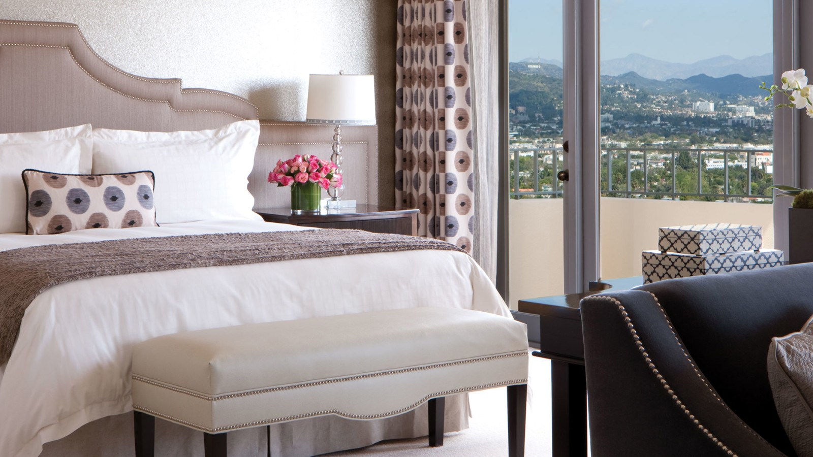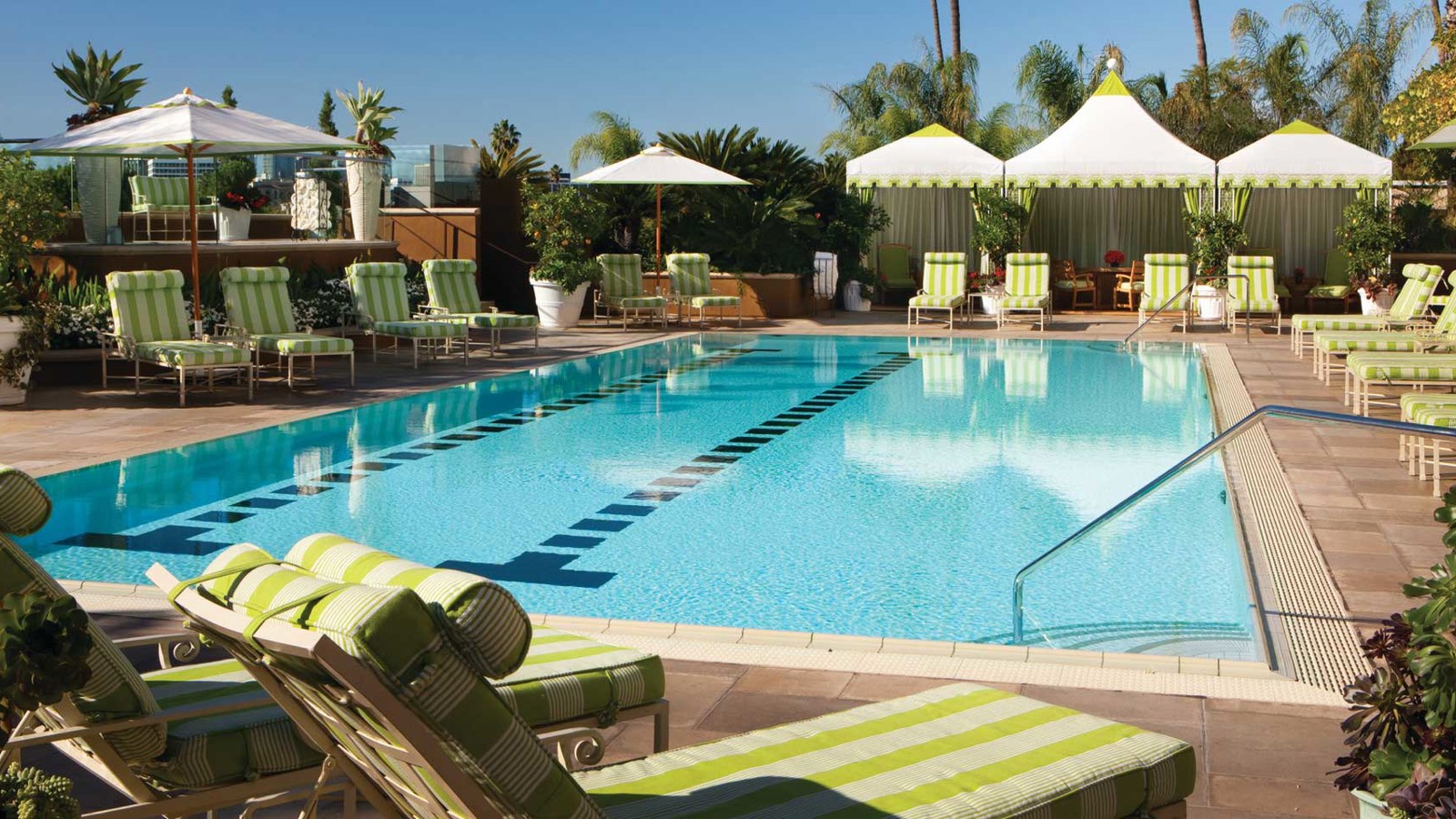 Four Seasons Hotel Los Angeles at Beverly Hills är en spännande mötesplats. Bakom den lummiga entrén möter en värld av klassisk Hollywood-glamour och den ständigt surrande energin av människor och möten. Hotellet med sitt diskreta läge har blivit filmstjärnornas stora favorit och här håller de gärna sina möten med journalister, så bli inte förvånad om du ser Arnold Schwarzenegger, Samuel L. Jackson eller Jessica Lange i någon av de karakteristiska franska balkongerna, eller om Penelope Cruz ligger i solsängen bredvid. Rum och sviter går i färger som förstärker den kaliforniska solen och alla har franska balkonger. East President Suite har hela åtta stycken, alla med milsvid utsikt över downtown Los Angeles och Hollywood Hills. The Royal Suite ståtar endast med endast fyra, men då kompenseras du istället med stor hall och öppen spis i marmor. Poolen har genomgått en ansiktslyftning och är nu mer glamourös än någonsin med sex cabanas tillgängliga för några av spaets unika behandlingar. Culina betyder ”kök” på latin och restaurangen bjuder på yppersta italienska klass under glittrande kristallkronor och har bland annat Los Angeles enda crudo bar där du kan njuta färska fisk och skaldjur ur den omtalade medelhavsmenyn.