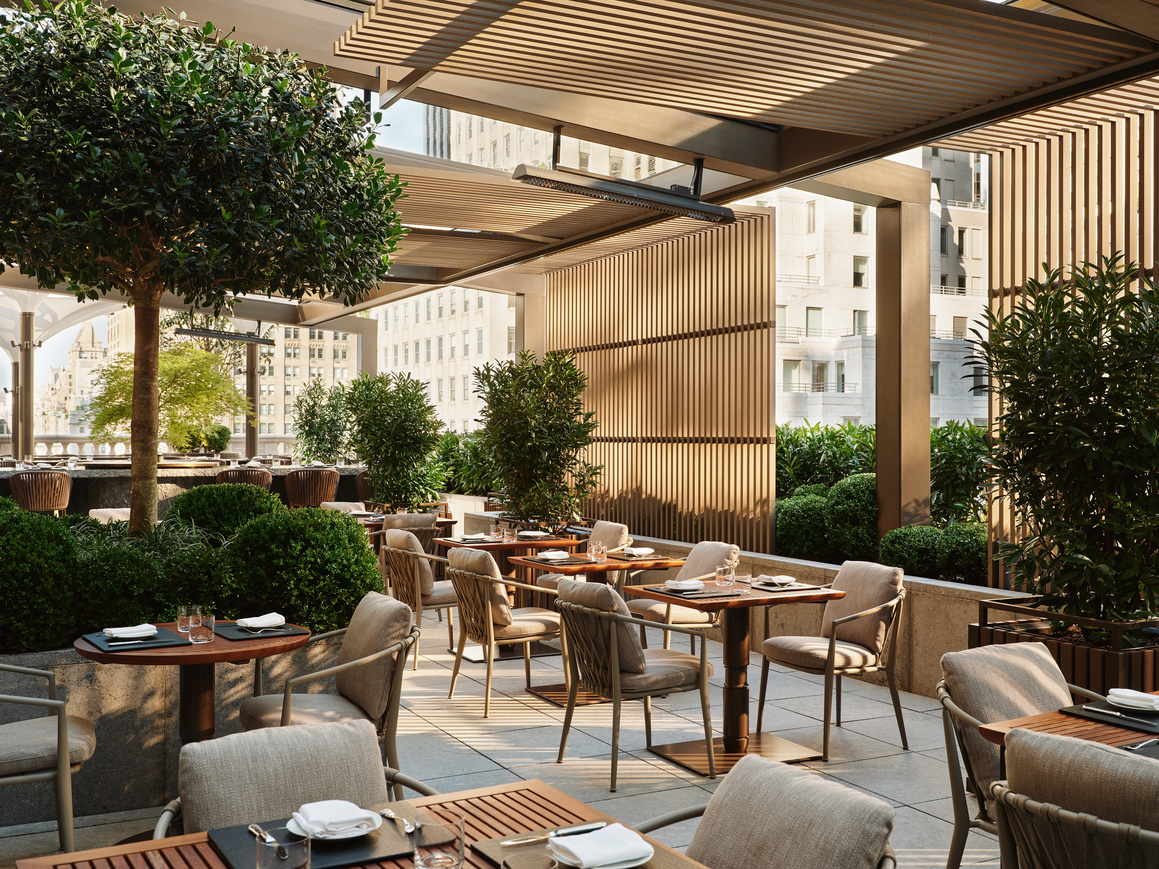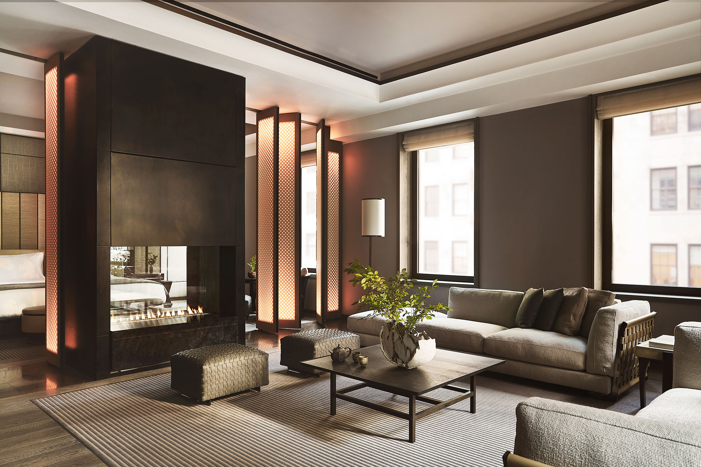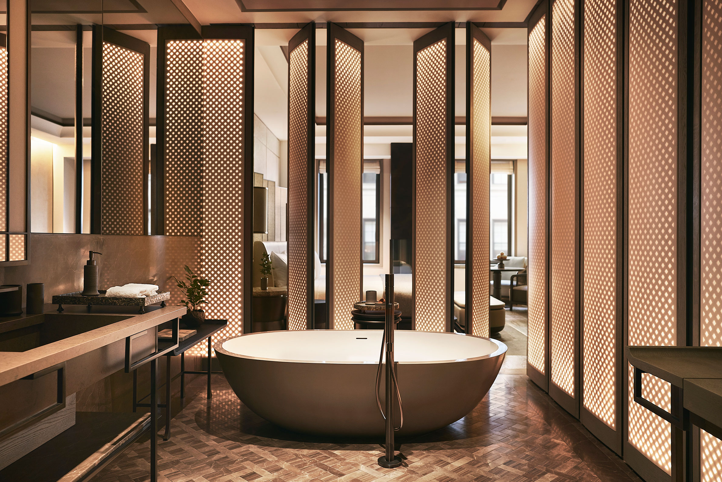 Hur ser en urban lyxoas ut på 2000-talet? För Aman New York handlar svaret mindre om glitter och flärd och mer om svårfångade stadskvalitéer som tystnad och stillhet. Det efterlängtade hotellet har efter många års renovering äntligen slagit upp sina portar i ikoniska Crown Building, mitt emot Trump Tower, i ett av Manhattans mest trafikerade hörn. Man har behållit mycket av beaux-arts arkitekturen intakt samtidigt som interiören uppdaterats med Amans lugnande, neutrala öst möter väst-stil. De minsta sviterna är 775 kvadratmeter och den största, på nästan 3000, kommer med både hamman och plungepool. Materialen är naturliga; chokladbrun marmor, sten, svart stål, ek och valnöt. Väggar och inredning går i nyanser av havregryn och skiffer. Tack vare de kraftigt ljudisolerade fönstren känns bruset från staden nedanför långt borta. Din svit är som en egen bubbla. Oavsett om du ligger i badet, i king size-sängen eller sitter på bänken intill öppna spisen och tittar ut genom fönstren, upplever du en känsla av fridfullhet. New York-borna dras till den skyhöga lobbyn på 14:e våningen, som har en gigantisk terrass med infällbart tak. Där finns Arva, en italiensk trattoria som serverar medelhavsrätter som saltad svart havsabborre och nygjord fusilli, och Nama, en mindre restaurang tillägnad japanska råvaror. Den andra stora attraktionen på Aman New York är det tre våningar höga spaet som erbjuder upplevelser fokuserade på antingen rysk banya eller turkiskt hammam. En utmärkt plats att komma ner i tempo efter en heldag i den pulserande storstaden